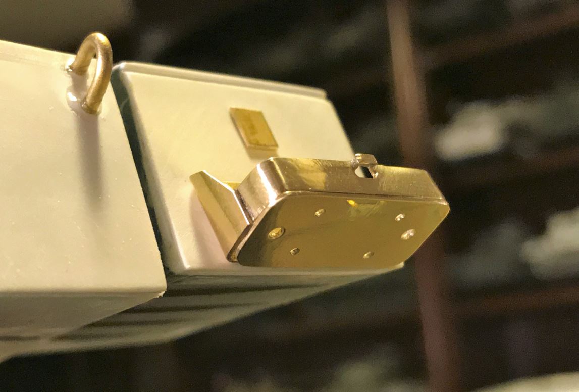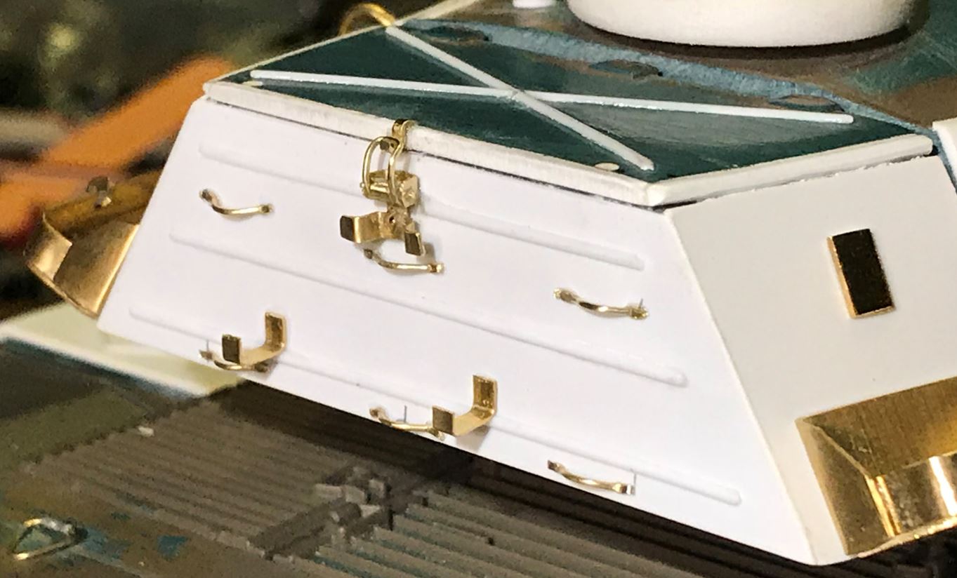 Below is the rear of the turret bin, with closing latch, tie downs and two brackets. The latch was created the best I could from the pictures I have seen. I am not really happy with it but it's so small, it needs a close up like the ones below to notice any inaccuracies.