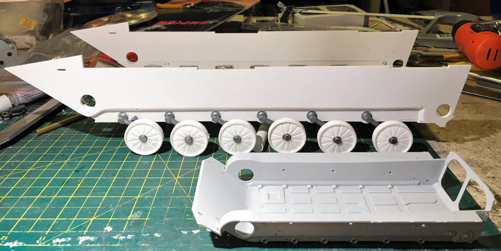 The lower hull is being assembled. You can see that the gearbox will be way at the front with the first road wheel supporting the brunt of it. It will need its shock absorber to be stable.