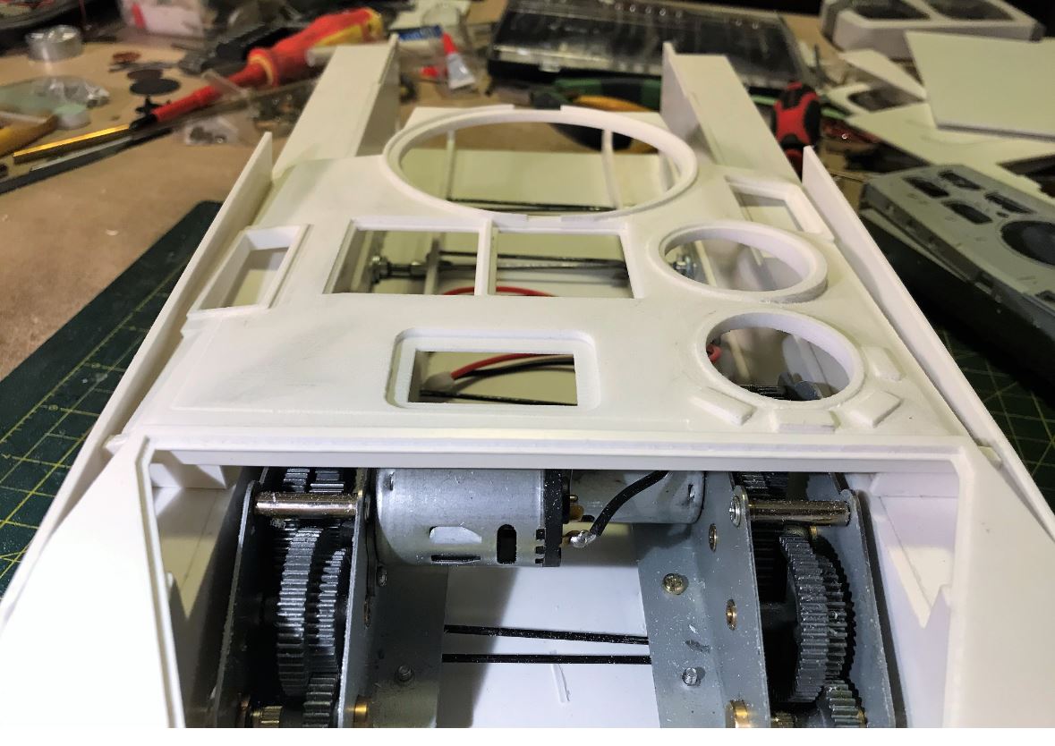 A PzIII gearbox is installed strait on the bottom beams, sockets for the screws were made with plasticard at specific locations, avoiding any contact with the torsion bars.