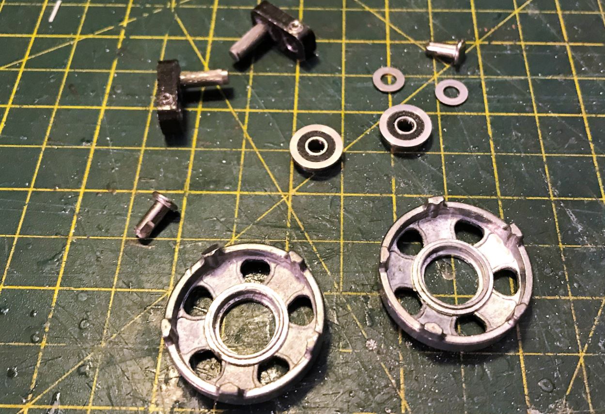 Modified Mato T-90 idler wheels were used, not ideal but at least they have 5 spokes. Once disassembled, the shaft on the exterior half was cut to create the core of a BMP idler wheel.