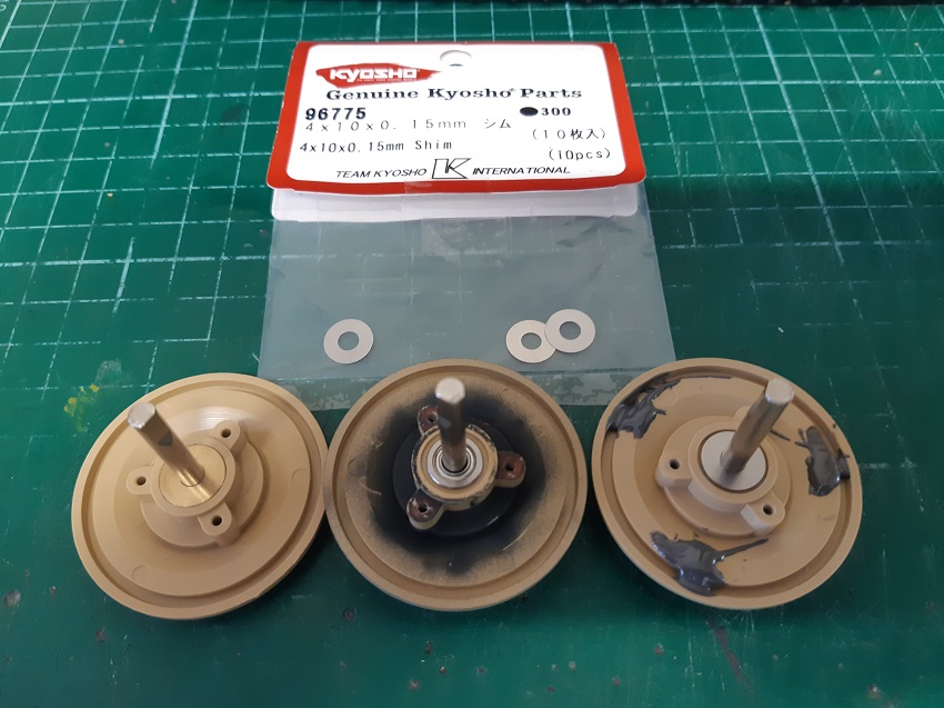 I went to assemble my King Tiger road wheels [56018FO] with bearings I got from Mitosal and found the axle wobble just as bad as the kit supplied bushes'.I thought that with upgrading to bearings, this problem would no longer exist. Wrong.I now realize that it was not just the early King Tiger kit[56008] that had sloppy road wheel kit bushes but the late[56018FO]as well .Schumo had made two replacement wheel bush kits with tighter tolerences.KT0028ST for the early King Tiger and KT0028FO for the late kit. If I had realized this I would have purchased one of these but E.T.O armour, Elite and Axles have no stock and will not be restocking. I went back to the bearings and found KYOSHO make a shim kit 4x10x0.15mm [Part NO 96775] which was perfect for my needs. The after market inner bearing you use on the wheels has a flange for it to sit in the plastic hub but only measures approx 9mm OD where the original bush has a 10mm OD flange. Also the thickness of the flange on the bearing is not enough so when the wheel is assembled the rear section of the wheel is not applying enough pressure to the bearings flange face for a snug assembly so now we have a wobbly axle. Slide one of these shims on to the axle so it sits on top of the flanged bearing and assemble wheel, now the flanged bearing is properly supported and no more axle wobble. My thoughts are if you leave this axle sloop, the flanged bearing will chew up the plastic section of the wheel it sits in as it can move in its seat and if the axles are not running true, this must put a lot of strain on the transmissions,especialy running metal tracks. I have seen these shim kits as low as $3.00 U.S and you will need two kits. I hope this is of help to some one. Reference to the picture below. From left to right.1 is the kit supplied brass bush 10mm OD. 2 is the Flange bearing 9mm OD.3 is the 0.15 mm shim on top the flange bearing then assemble wheel. Note. Do not use rubber sealed bearings with this mod. In the way they are constructed the rubber seal is flush with the inner and outer edges of the bearing and the shim will rub on this for a non smooth rotation Trust me you will like this mod. Regards John.