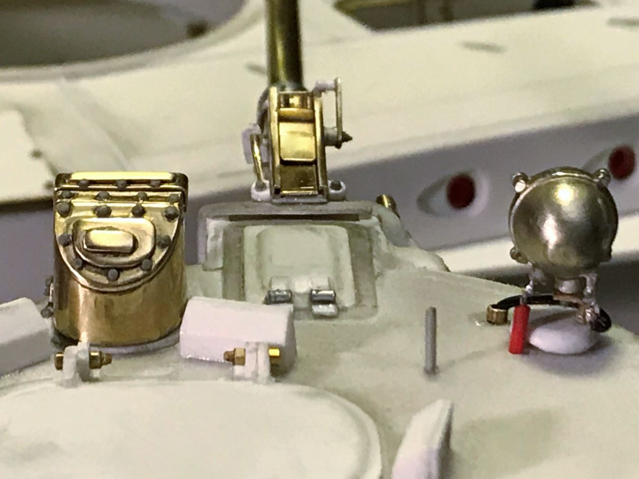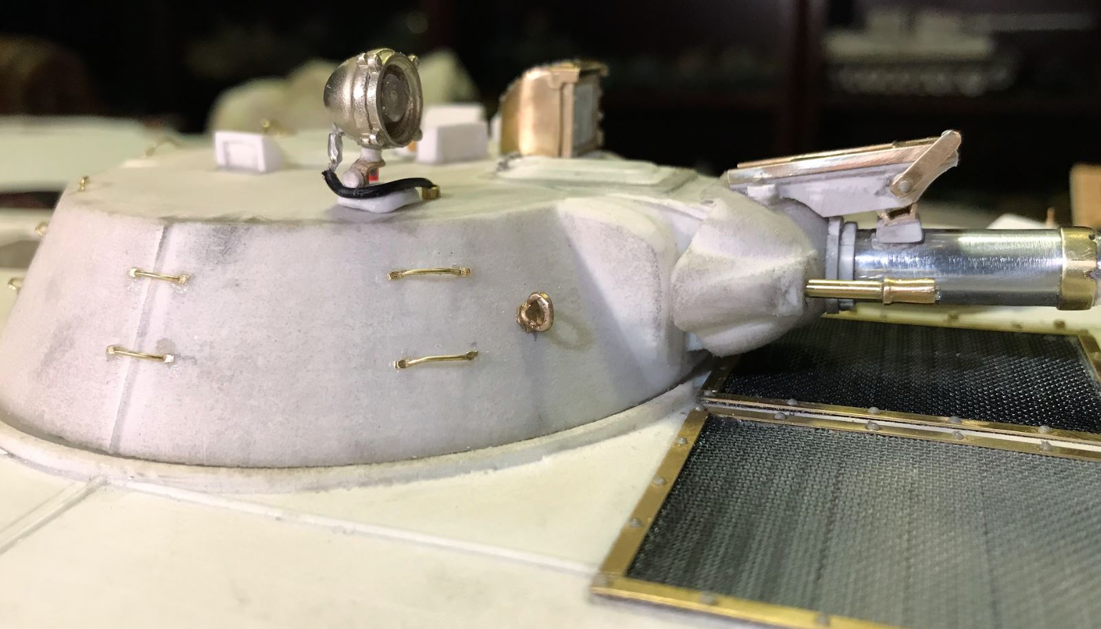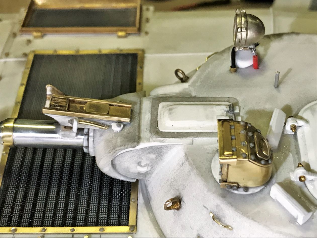 I had to study all references to recreate the exterior. The spotlight is an T55 item from AFV_Model, the rest is scratch built the best I could with what I had in material, with the couple of days I wanted to spend on it. The optical device was fun to build in brass.