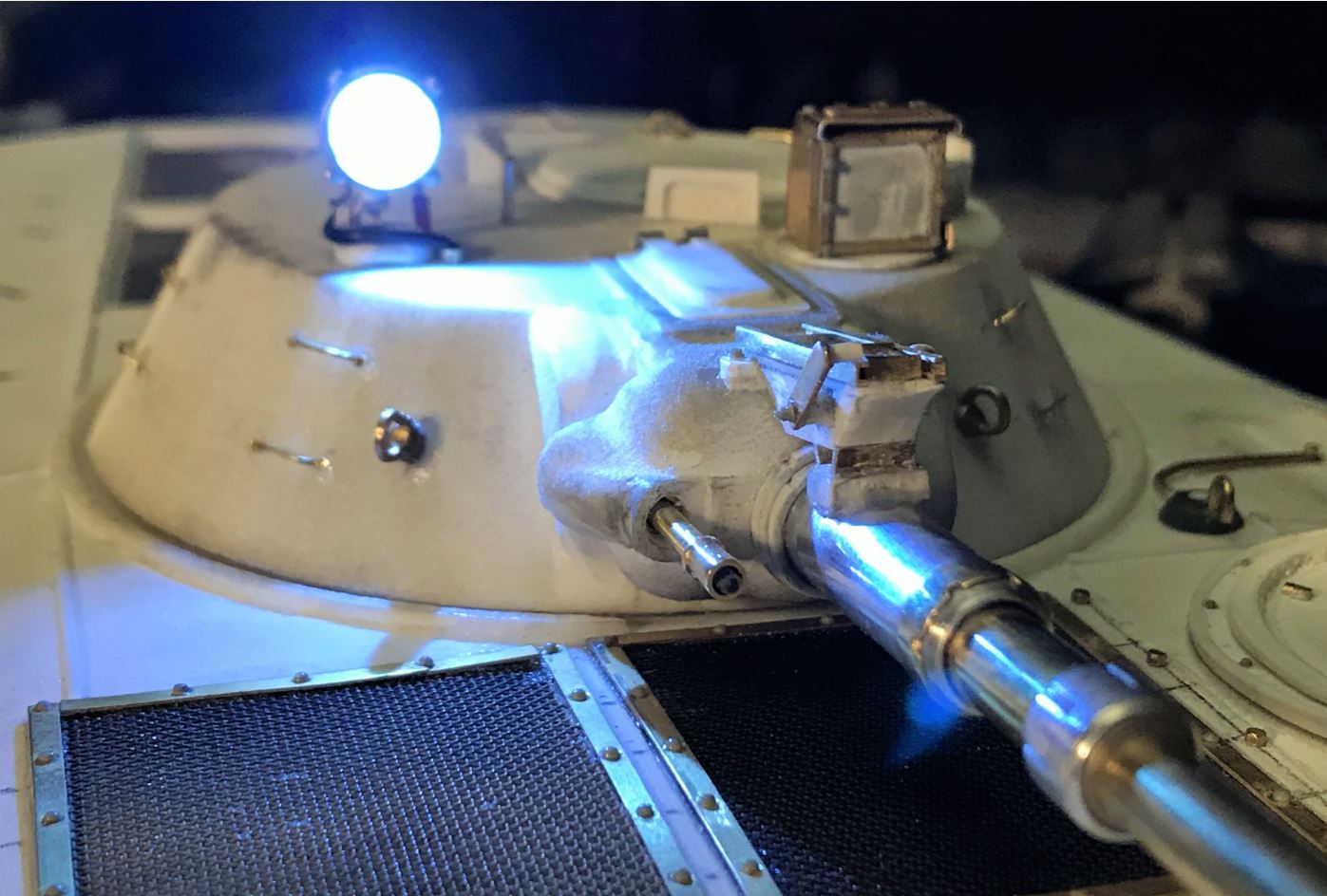 A 5mm LED was inserted into the AFF-Model spotlight. I saw some BMPs with a infra red lights instead of the provided white spotlight so it is an alternative. The clear lens will be installed only after painting.