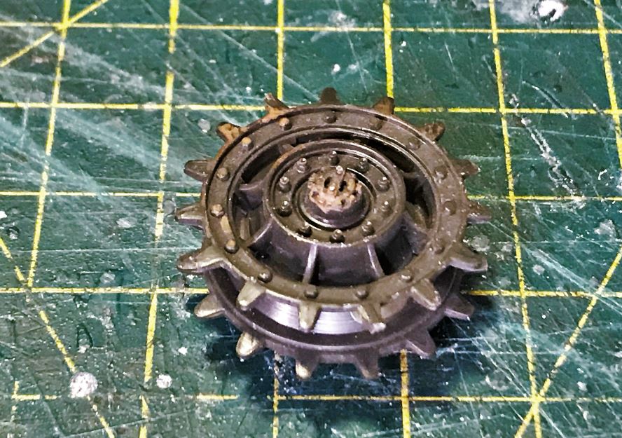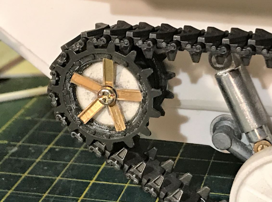 The assembled BMP sprocket. It looks a bit weird like this but it has some basic features of the real one and it runs well in testing. The 1/24 plastic tracks are very light so the plastic sprocket should not have problems running the BMP inside the house at least. Once provided with a hub cap, it should look better. It will have to do until something better becomes available on the market.