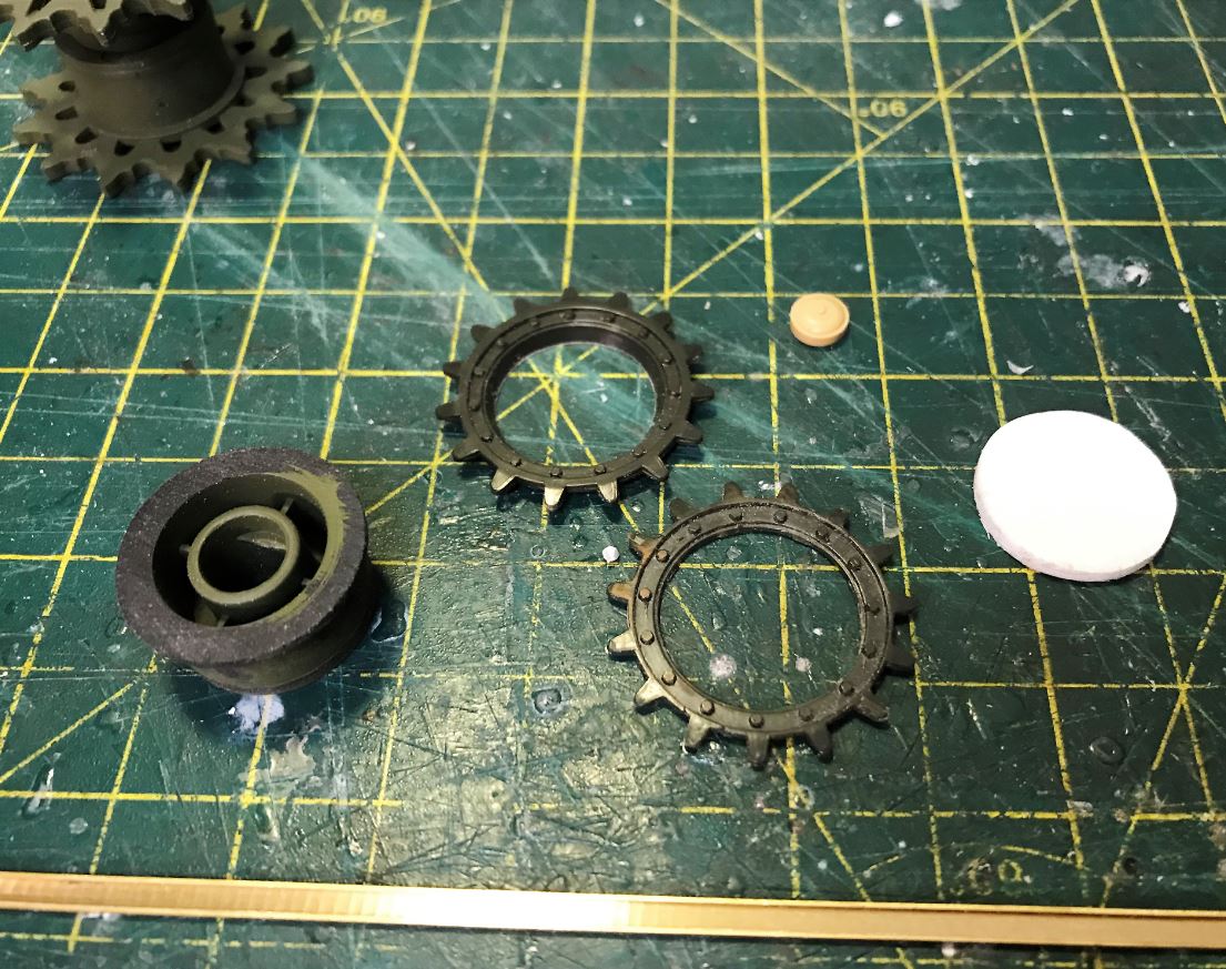 I previously tested a modified (highly reduced) HL Sherman sprocket to fit the 1/24 tracks but it ended up being too small and it did not look good. While going through the bone yard, I picked up old Tamiya 1/25 Centurion sprockets with teeth that seem to fit the Sherman 1/24 tracks quite well.
