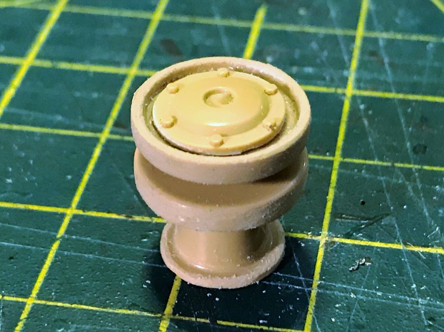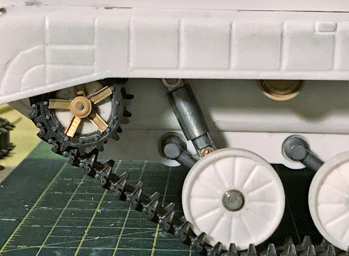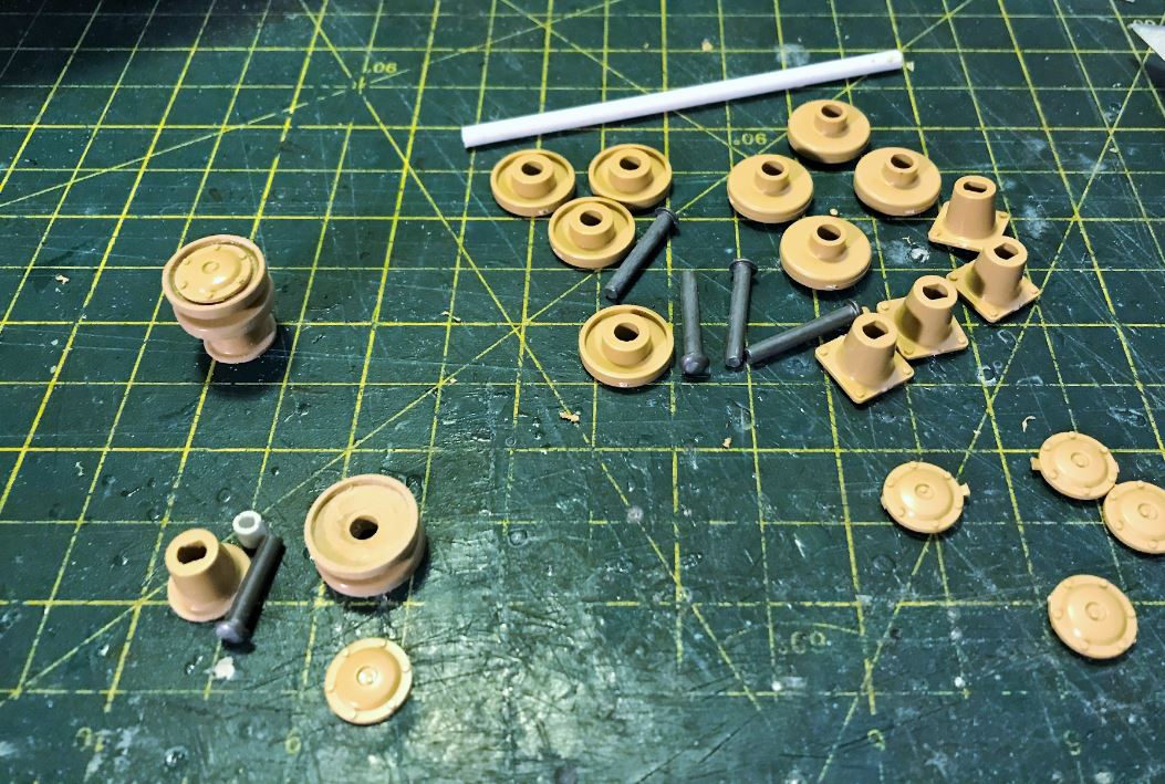 Scavenging the spare parts reserve, I ended up selecting Tamiya PZ-IV return rollers that I did not use on a previous project. Although the real roller is a drum type, the basic components were there to recreate something close enough, most of it will be hidden behind the side skirts. The hub cap is from the PZ-IV road wheels.
