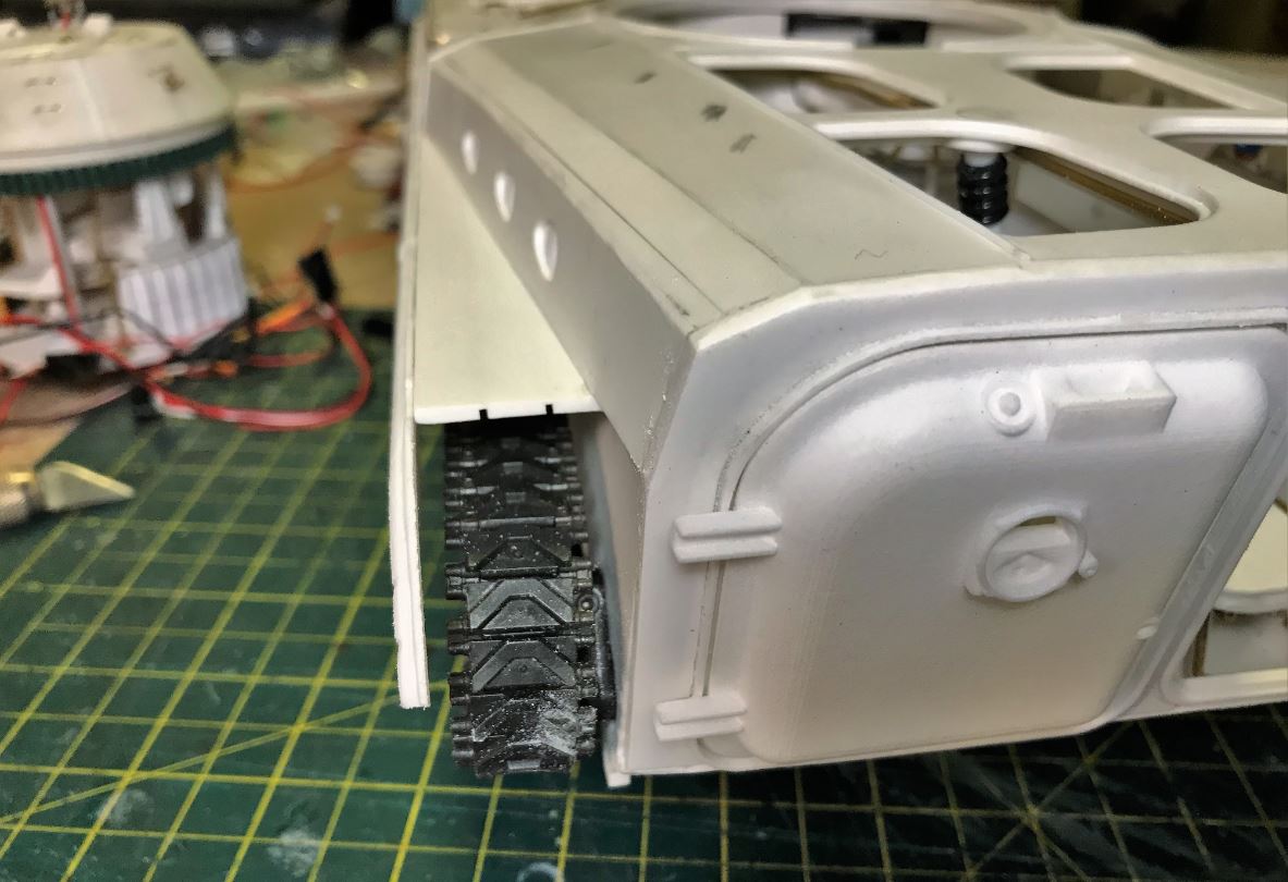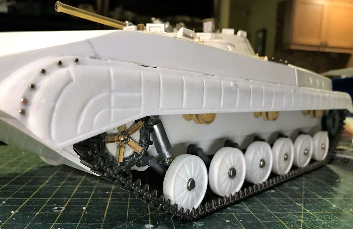 Although these 1/24 VS Sherman chevrons are not accurate for the BMP, the width and shape of the tracks are pretty good. No need to adjust anything between the hull and side skirts to make then fit.