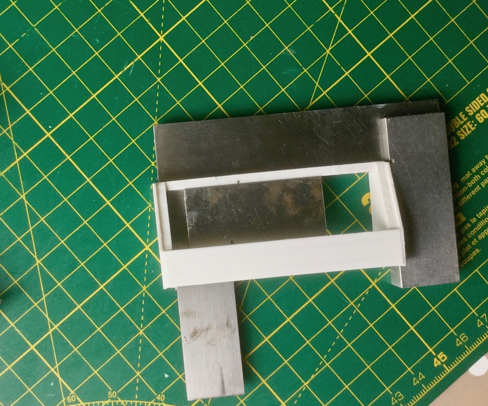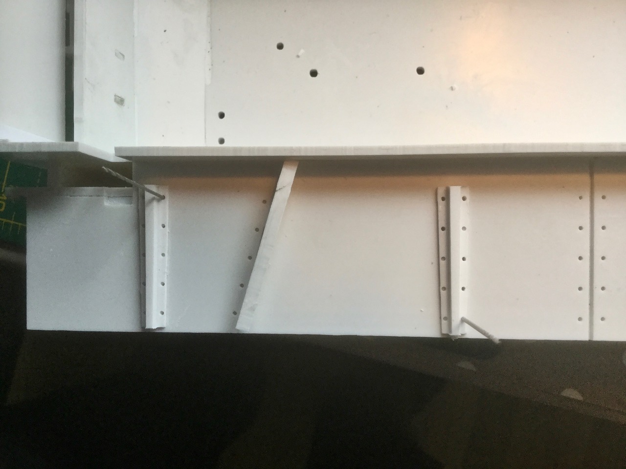 As this is going to be a fairly stressed part of the model when the tracks are fitted, I decided to bond in some supports (little bulkheads) between the plates in the sidewall, just in front of the retaining screw.