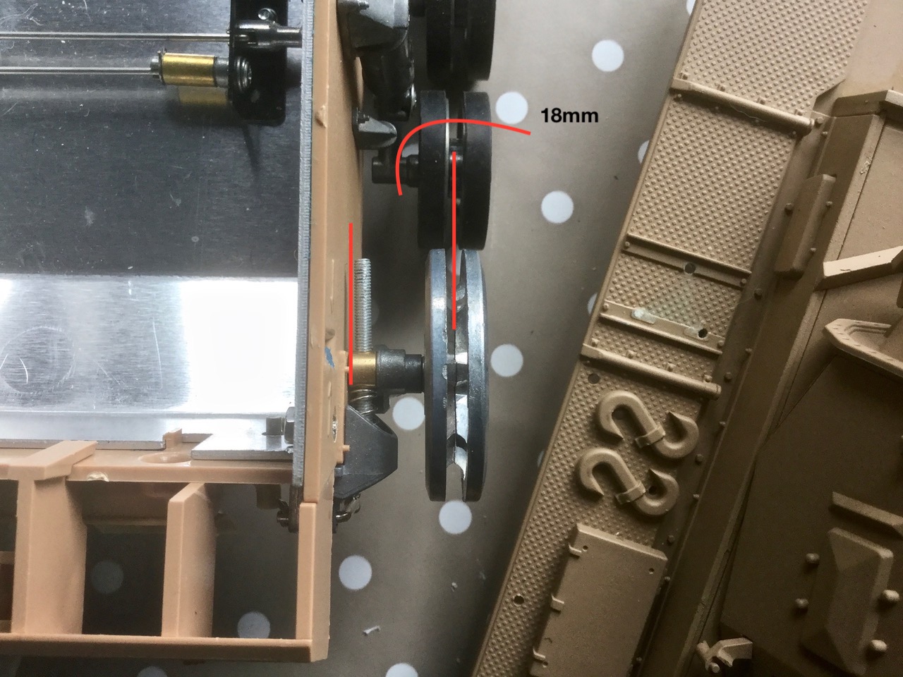 I'm guessing that the Pz 111 return roller mountings have been glued in place, because unless there's some locking arrangement (nuts and washers) immediately behind the outer hull wall, there's no other way of attaching the mounting. :eh: Why? Well, the standard axle supplied with the mounting isn't long enough to go through the roller (even starting from the midpoint of the roller, some 18mm from the outer plate), the mounting, two walls and a gap. Have a look at this: