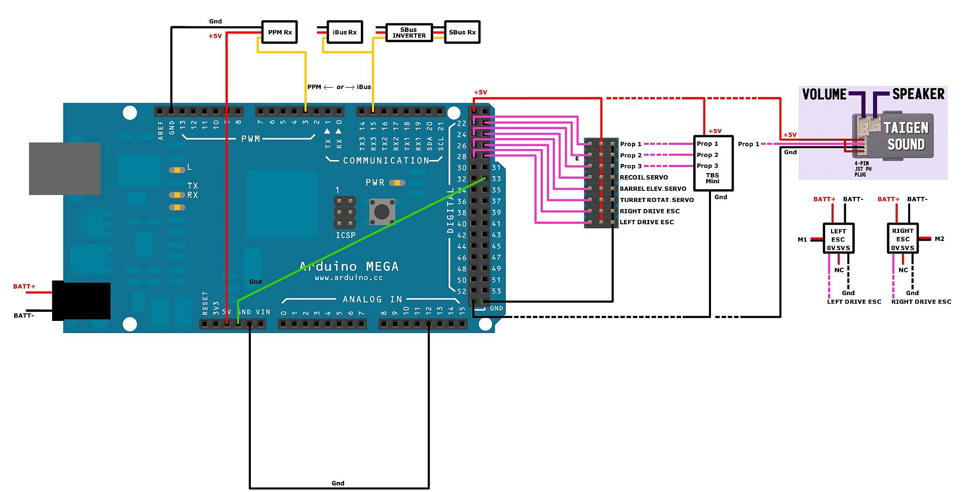 Many thanks, that makes sense. I just need a PWM>PPM converter, cheap to buy, and two speed controllers. I have a Benedini Mini clone on the way for sound.