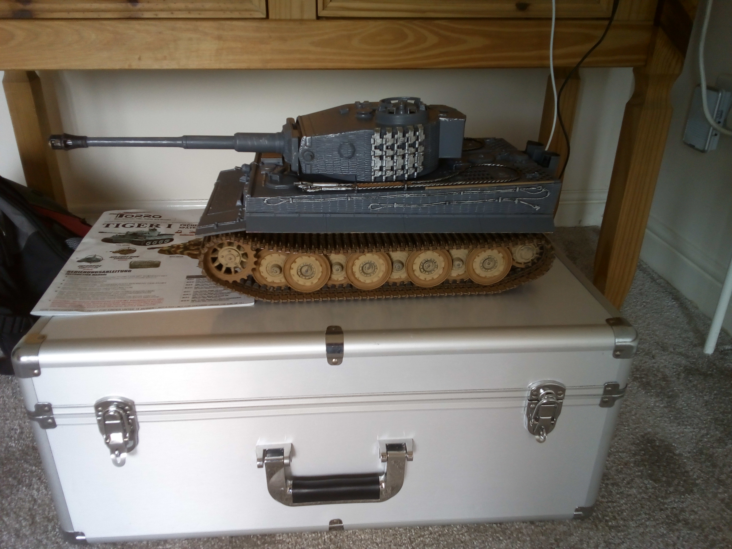I picked this one up off Ebay, bit of a bargain. Metal recoiling barrel, torsion bar suspension, gearboxes on a metal plate, muzzle flash, zimmerit, switches and volume under the front hatches, and came in a huge aluminium flight case. The gearboxes 'look' like HL white metal, but they must be steel gears as it runs silently and smooth as silk.