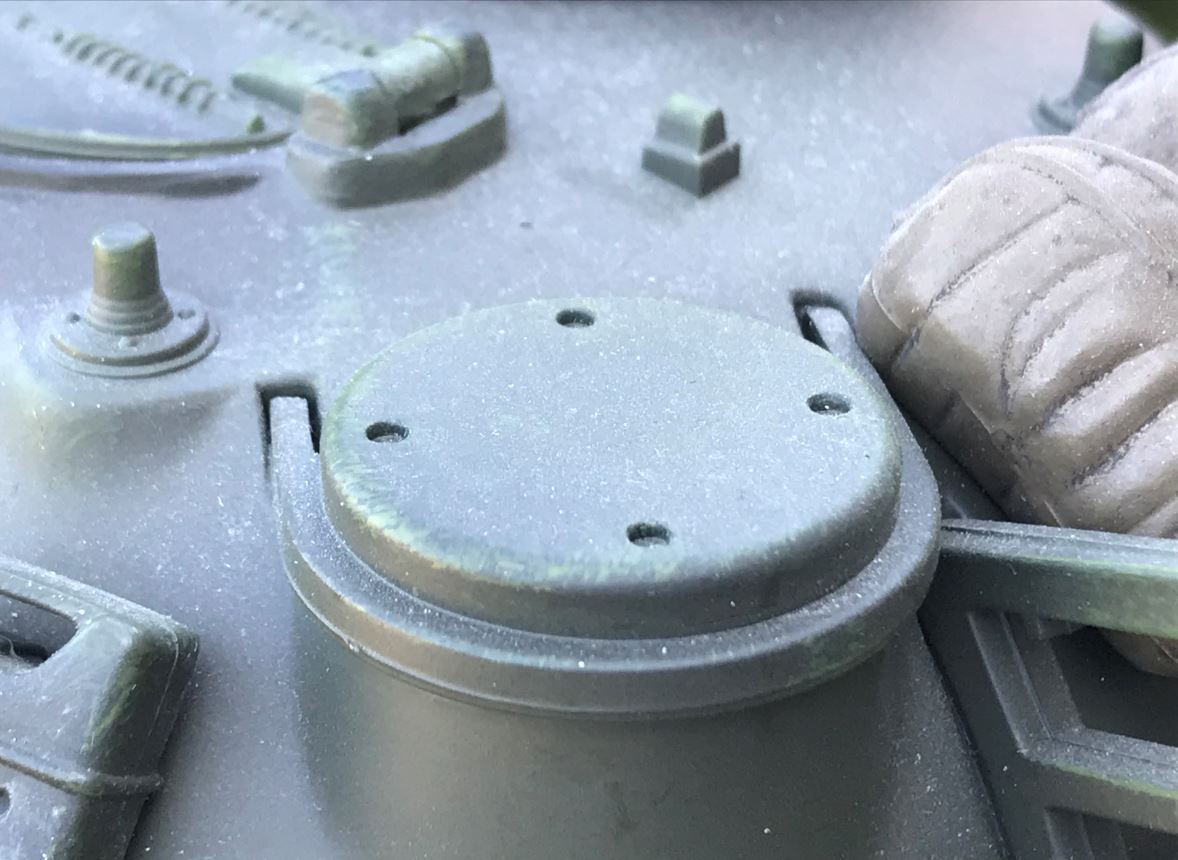 The ventilation cover was reworked, reduced by 2 mm in diameter, corners made round with shape inspired from reference picture and Dragon kit. It sits on a new base made of plasticard. The 3 attachment points are a bit too big. I will try to find smaller ones.