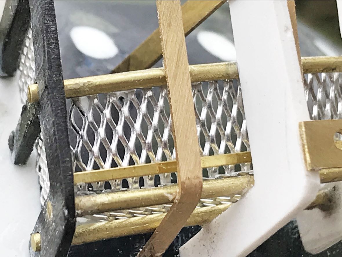 Easily replaceable with 1mm brass rods with 5 attachment points. The 3 middle attachments are first installed and given a groove into which the horizontal rod will sit on. Then the 1mm rod will run from attachment 1 to 5 in a solid integration. No need for soldering, superglue is fine.