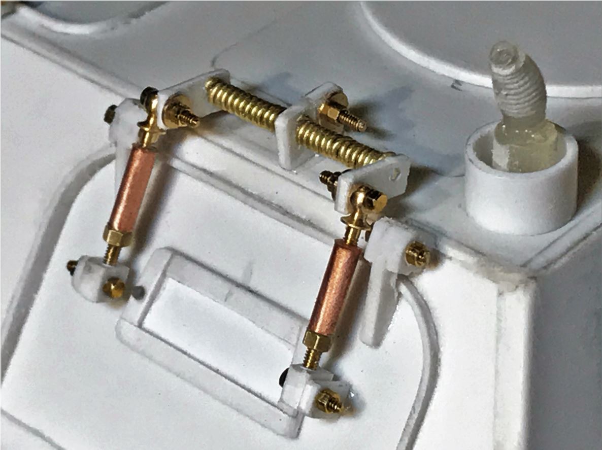 With a total of 15 hatches of different shapes and sizes all around the vehicle, completing the "hinge" job on this model requires patience and an assembly chain. Ludwig provides some basic hinge shapes but they need to be downsized by about half, and there are too few of them, so many hinges need to be completely created from residual plasticard sheet. M1 x 5mm bolts and nuts are also required for most.