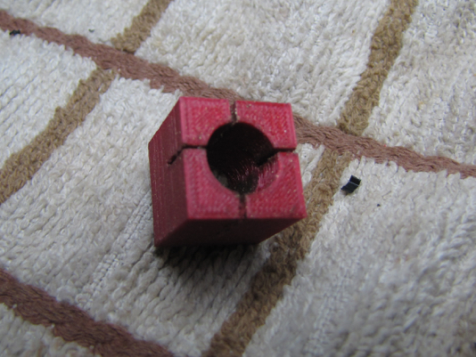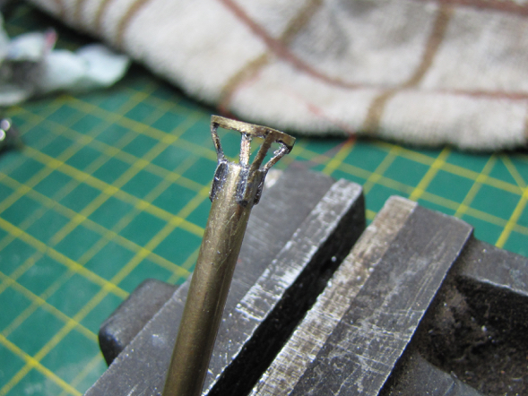 After making the 8 cuts with a razor saw, the scrap pieces were cut out and the prongs filed to size. The saw block proved useful to hold the tube. And was again used when the embryo cage was cut from the tube.