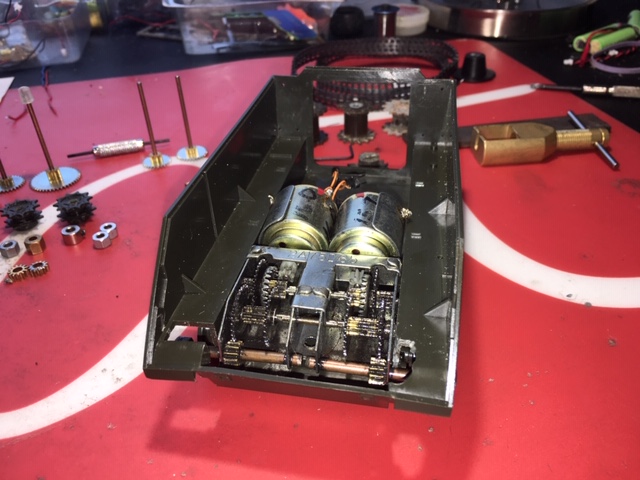 With a little work, this dual motor GB from a Japan type 74 Tank fits the APC hull. Was not sure it would fit. There are two types of these, it has to do with how the drive axle is mounted, Hi or low. This one is low.