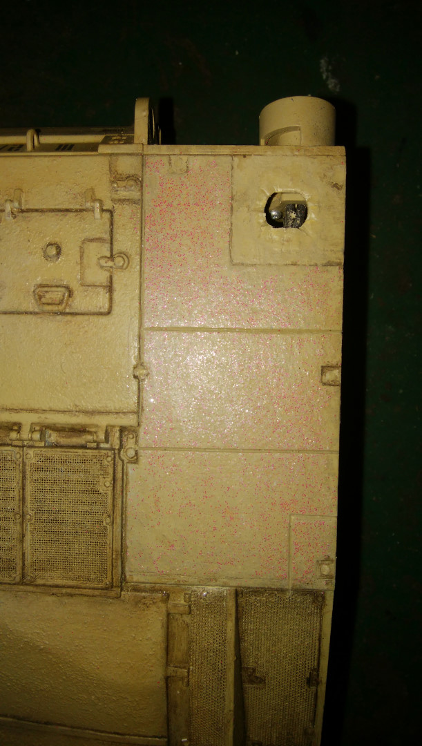 This is a picture with the battery lid temporarily set that has been blown the oxide red surfacer. Then apply anti-slip on this surface and blow light sand color lacquer. I used ABER 1.5? NUMBERS for the small numbers displayed on the lid surface. These are very small and hardly noticeable, but they are my complacency. I don't intend to take this model to the craft level (I don't have such skill and patience), so I think I should compromise somewhere. I think one indicator of the appearance detailing level is the 1/35 scale model of Mengmodel. However, I am still worried because setting such a level still leaves much to be worked on in this model.