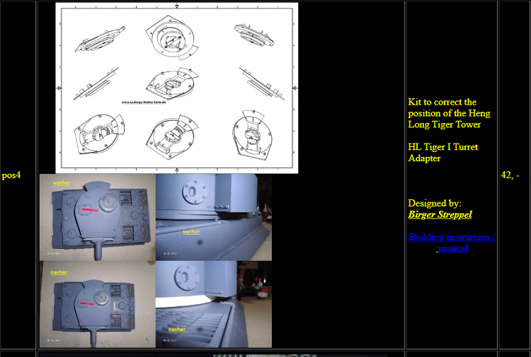 When I corrected the offset Turret on my Heng Long Tiger 1 I adopted the cuttings and grafting method to re-position the turret in its correct location. Although this kit was available then, I was not aware it was available from Ludwig until all my work was done. I have listed it here as I think for those not confident about cutting up their pride and joy it is a great kit that works without the hacking about. http://www.ludwigs-hobby-seite.de/Tiger1zubehoer.html