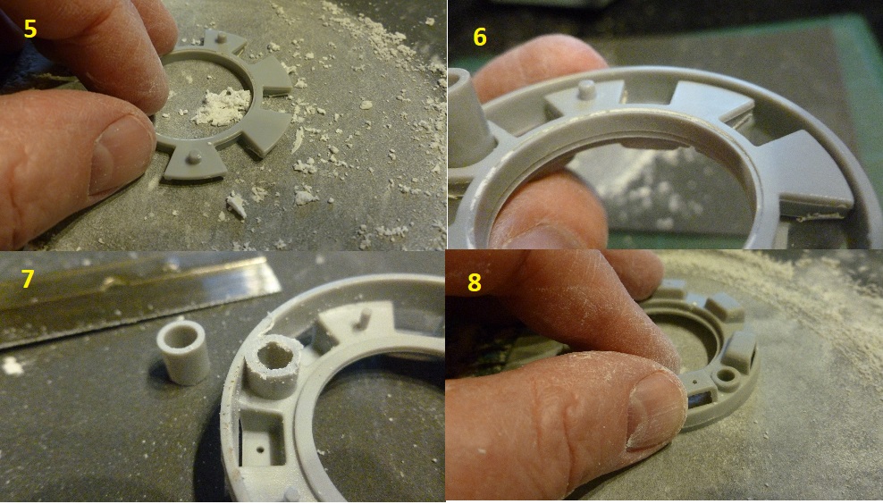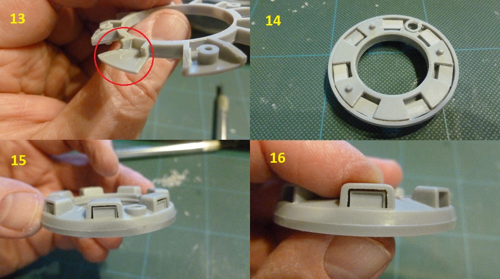 On the left is a 2mm thick styrene base plate which is 1mm larger than the diameter of the top plate. The "Tab" plate is made from 1mm styrene. It just took careful use of a set of small diamond files and patience to get the best scale fitment and size.