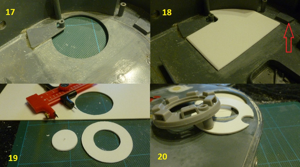 19-Using a Jakar compass cutter the missing circular section of the turret roof was cut.The outside diametre matching the old upstand aperture and the inner circle a few millimetre's smaller than the centre hole of the Cupola base aperture.The Heng Long turret roof is 2.0mm thick as was the styrene card used.