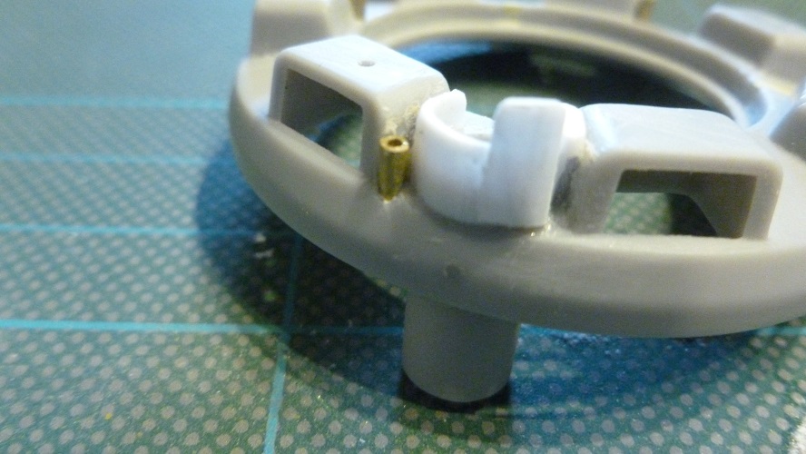 The next item to be added were the two small tubes that extended vertically one on opposing sides of the cupola. These tubes were designed to hold the base poles of a frame that unfolded to form an "umbrella" that covered the hatch and gave the Commander some shelter from the elements when operating with the hatch open in the rain. These were formed from brass tube 1/16"x.014" (1.58mm x 0.353mm) and glued into holes drilled into the cupola base.