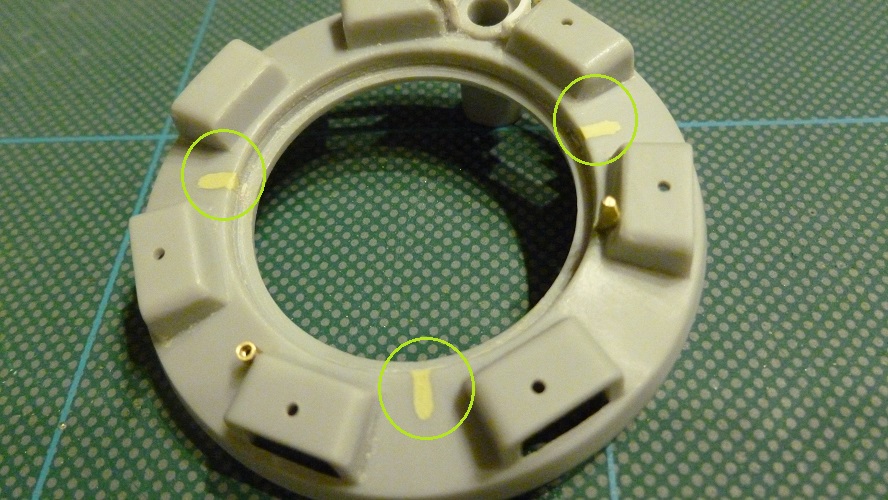 22-Drill three 4.5mm holes into the new roof section. This was aligned and marked by placing a few spots of black paint on the pegs on the bottom of the Cupola base.