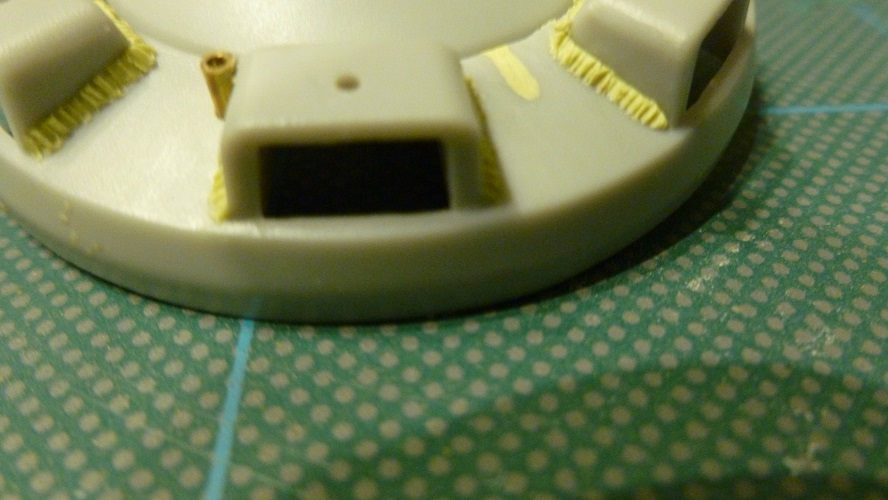 20-After gluing back on the Turret lid mounting post to the Cupola base plate a hole was drilled/filed into the replacement turret roof section to allow the post to pass through into the turret.