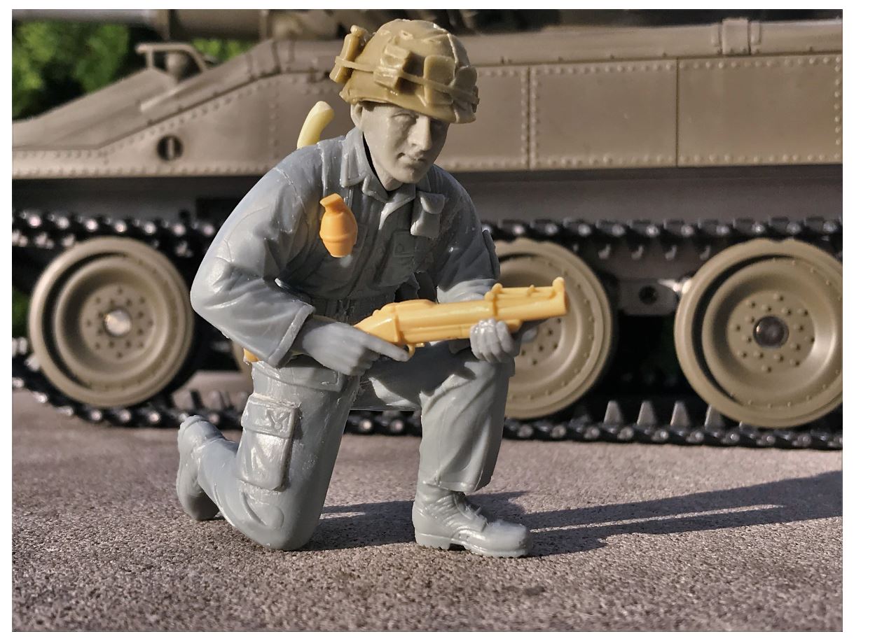 After trying various locations, I determined the best fit for the squad point man is on the turret front air fan cover, which offers a flat surface for sitting on and a good view of the bushes ahead. Anything that moves in front will get shot at.