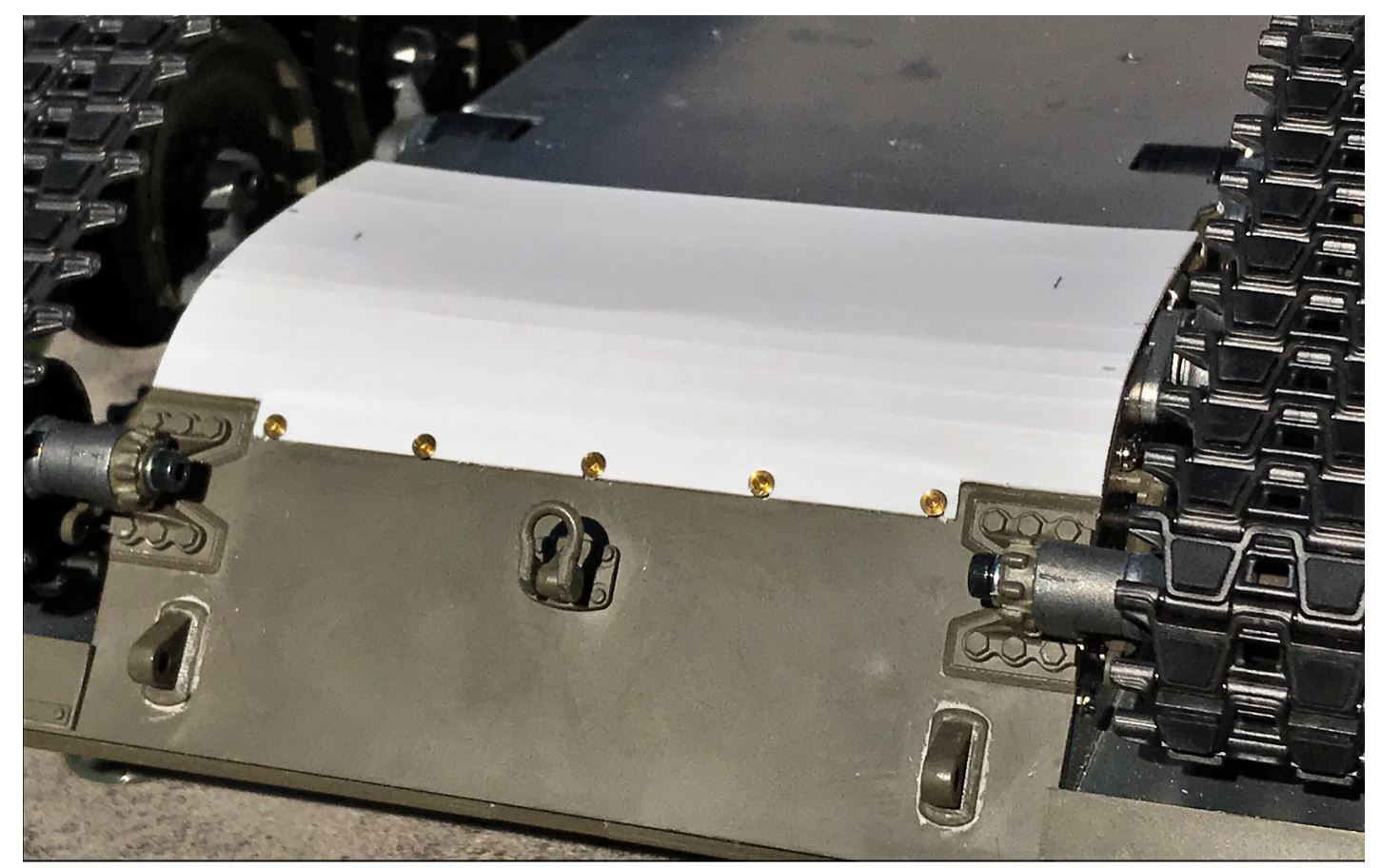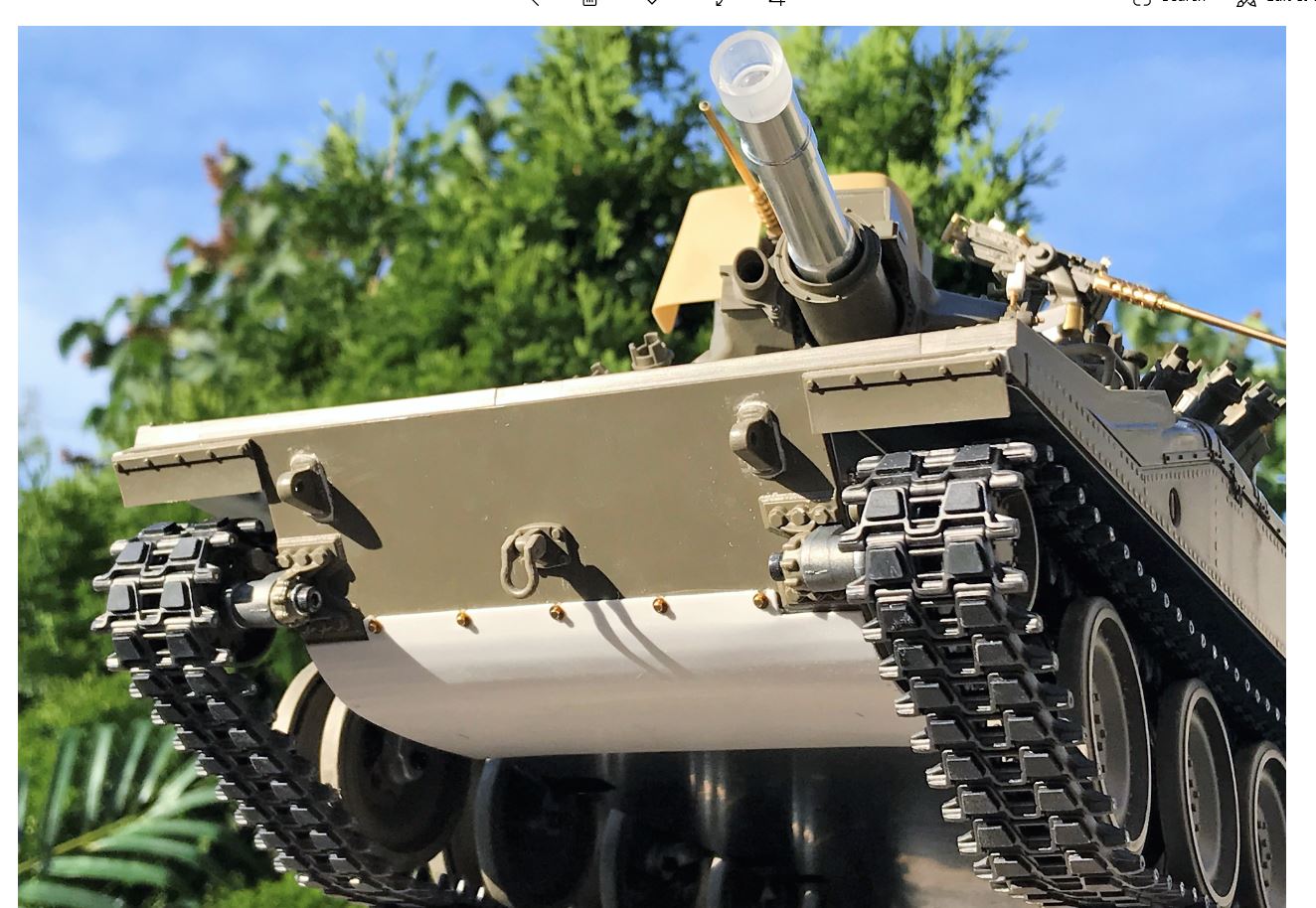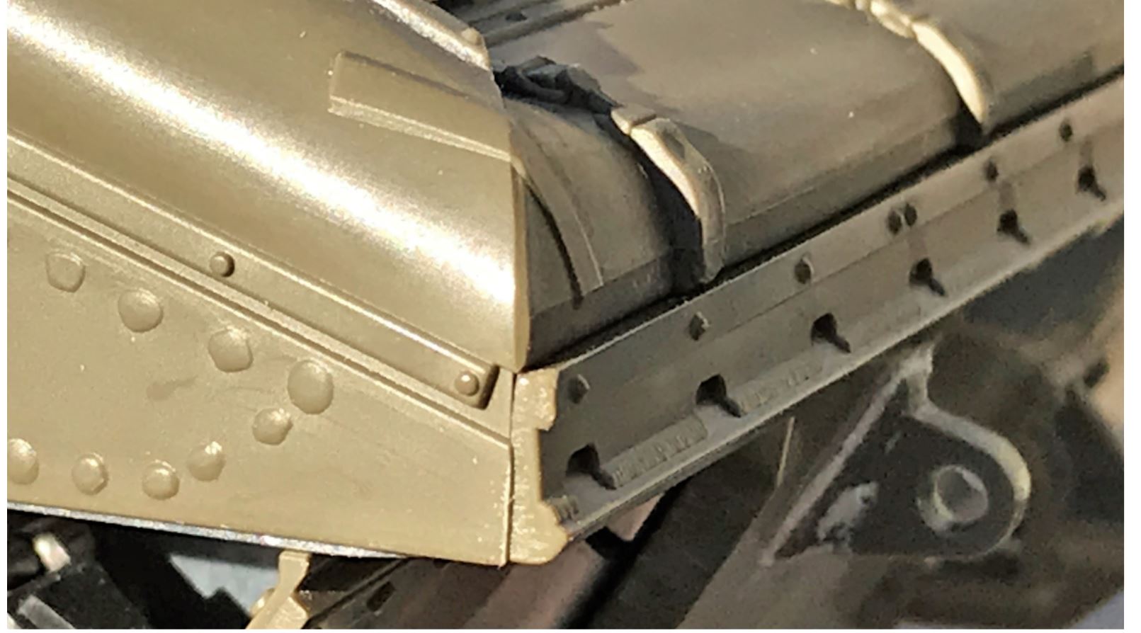 The visible add-on armor section is easily reproduced in plasticard and glued in place. The Tamiya bolt heads were replaced by M1 brass bolts with a washer and screwed in place to hold the armor plate like the real thing.