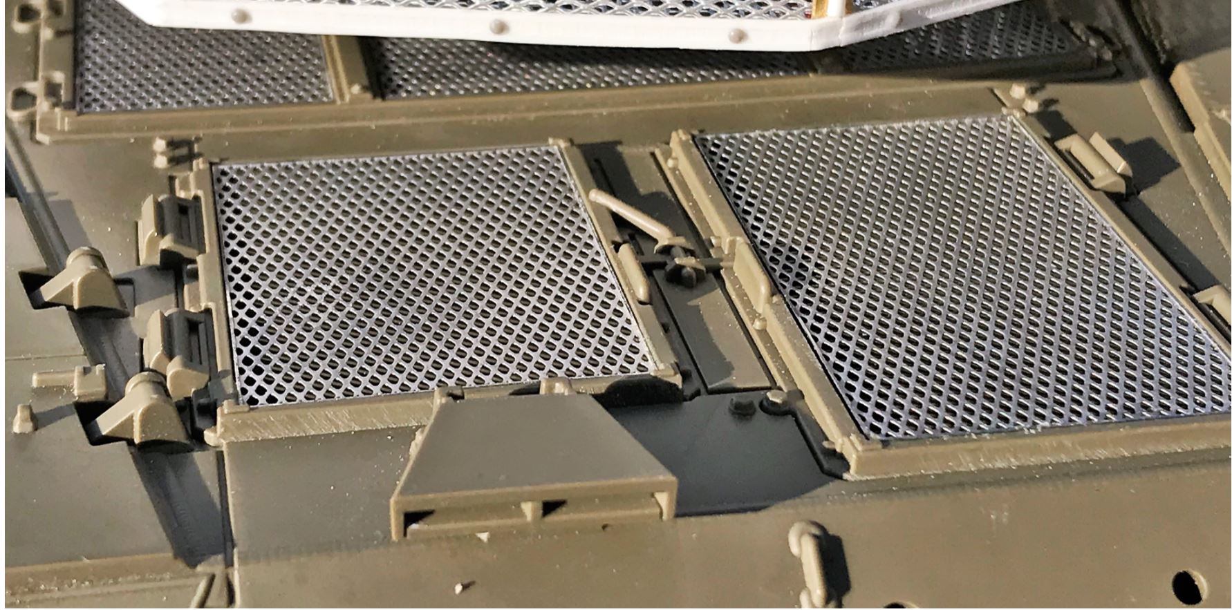 The Tamiya engine grills are put on, a perfect fit. There must be something wrong with them for Voyager models to propose a totally new set of engine grills. Whatever extra they provide, I found the Tamiya grills to be acceptable to me. I would normally have replace the solid grill handles by brass ones in 1mm rods but they are located in a way that make the removal of the plastic ones difficult. Still TBD.