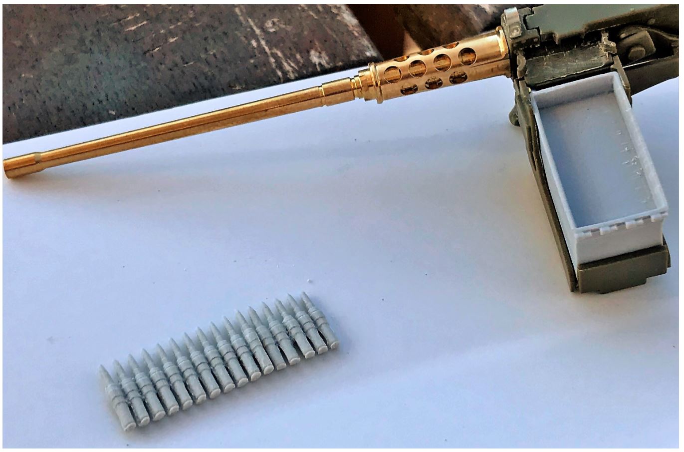 With the "open" variant of the ammo box that is perfect for this build, about 0.5mm can be removed from the front and back side of the ammo box without damaging them. It is just enough to slide them in the M2 cradle with some light pressure. As for the ammo belt section coming with it, the resin between each ammo can be cleaned for a nice looking belt section. Not as perfect looking as the Aber brass ammo and PE links under the skills of a Photo-Etching master bender, these resin links have the benefit of providing acceptable results with limited work.