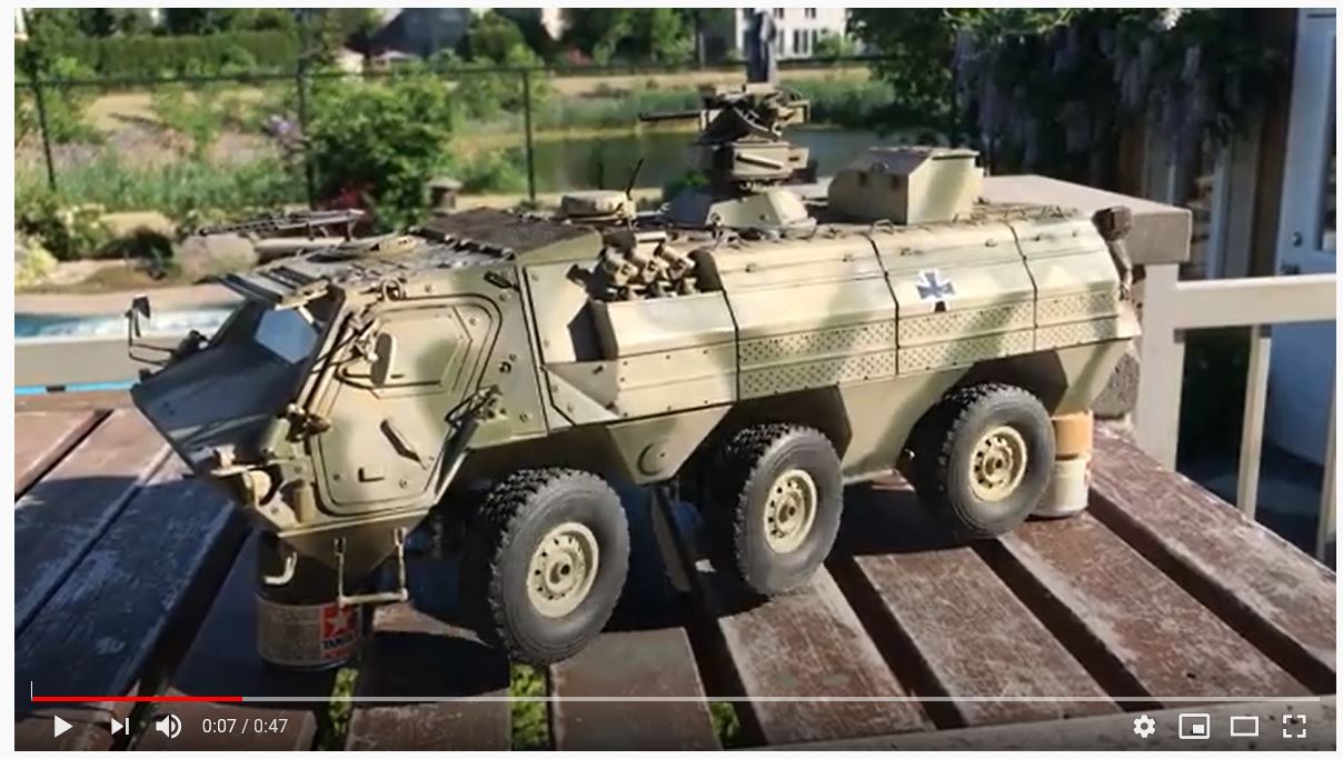 To finalize the build, here is a YouTube video link for the Fuchs in action with some cat hunting and a ride into thick terrain. The cat made good his escape before I could shoot the automatic grenade launcher. The twin engines and steering are performing well.