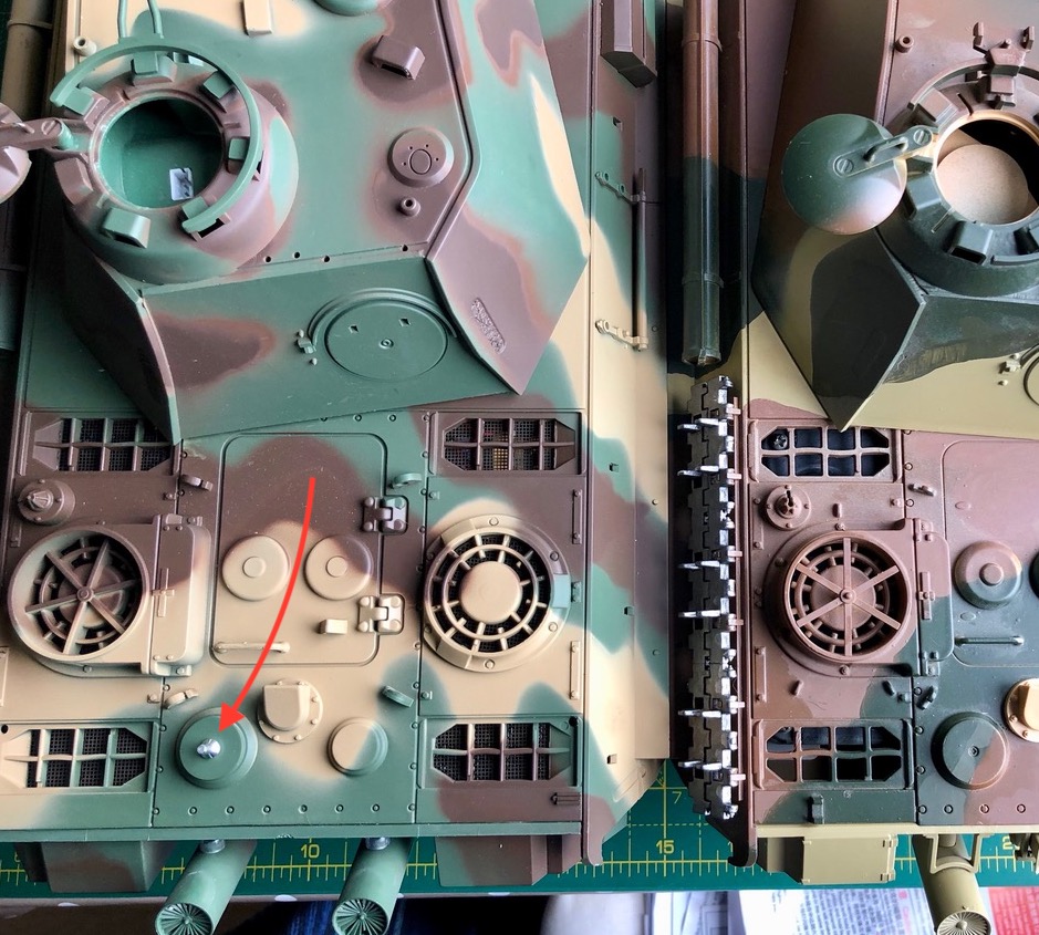 A decent grippy pair of pliers did the trick, and a blob of Milliput was used squeezed in to fill the gaping hole. When it's dry, I'll brush a little pint over it. Note that on the Tamiya Panther G, both those vent covers are are indented in the centre. This one now has an indentation.
