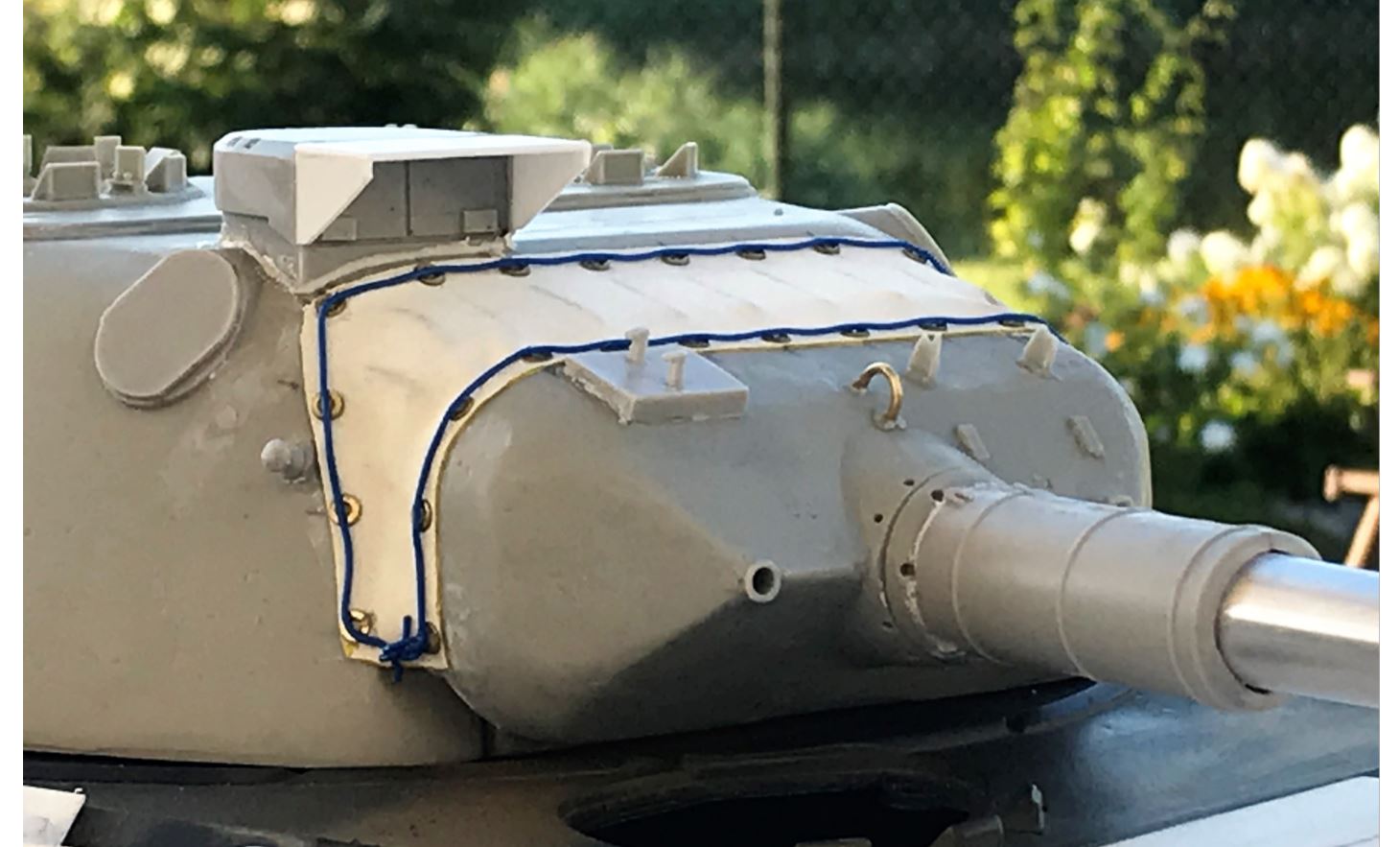 The 1/16 Perfect Scale Modellbau turret correctly features the plates over the bumps for the 1A5. However, the parts for the bumps are included in the kit for the modellers who want to reproduce the Leopard 1 A1A1 version. Its too bad, they are looking great. The sun shade for the EMES 18 housing was created with plasticard.