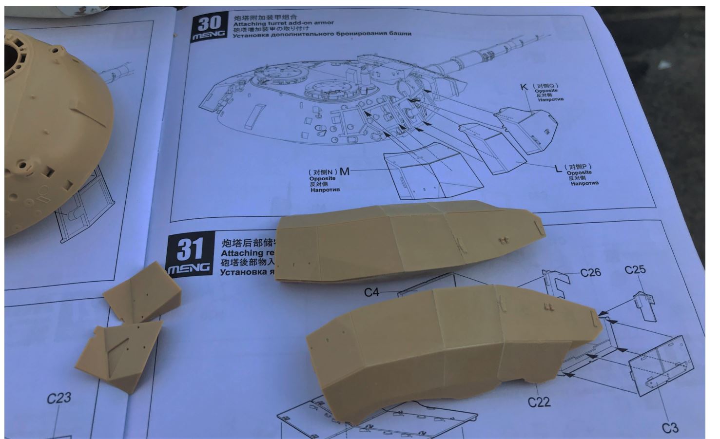 The Mexas is complicated. It is simpler to built the Mexas side as a whole instead of trying to recreate the individual modules with the hope that they will eventually come together. Each sides has a total of 25 visible asymmetrical faces, with construction and angles in 3 dimensions, and you have to make 2 exactly he same. Unless you want to spend months building this, redoing everything 3 times or simply give up, it is better to do exactly what Meng provides in 1/35 and extrapolate to 1/16, including following all angles during the assembly. The slightest deviation will cause trouble sooner or later in the construction.