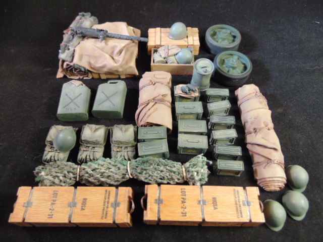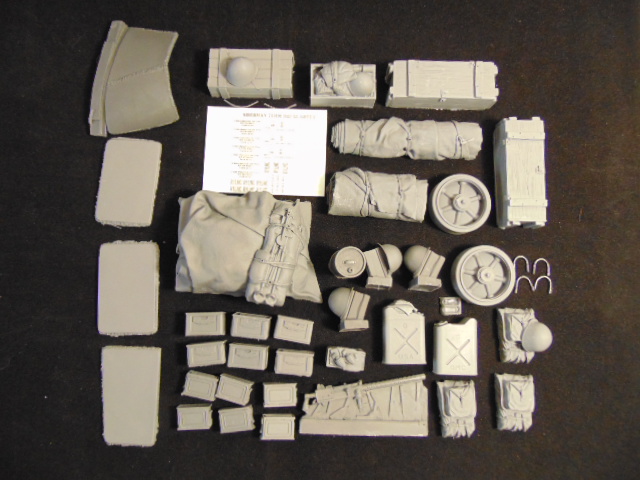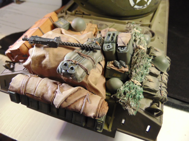 There are so many details and extras in this package from the ammo box decals for both the main gun boxes and the .30 and .50 cal boxes, to the carry handles supplied separately and not molded onto the boxes. I love that because you can position them how you like more realistically. The .30Cal MG which alone would sell for like $15.00! I have all 3 types of ammo boxes for the Shermans. 76mm, 75mm, and 105. The 75mm is what is pictured here, picture #3. The 105 would be for Tamiya and HL models, if you have a Fury model from say Hooben, then the 76mm is for you, and the 75mm goes with the Metal Mato model or any of the scratchbuilts from the makers on here. You will also receive 25 sandbags and one of my famous scrim nets as shown on my early Sherman in the pics. Plus you also get the piece of real hardwood board (Shown last pic mounted on my Firefly) as seen on the front of so many Shermans. The one you will receive is not notched but just straight across for regular transmission cover.