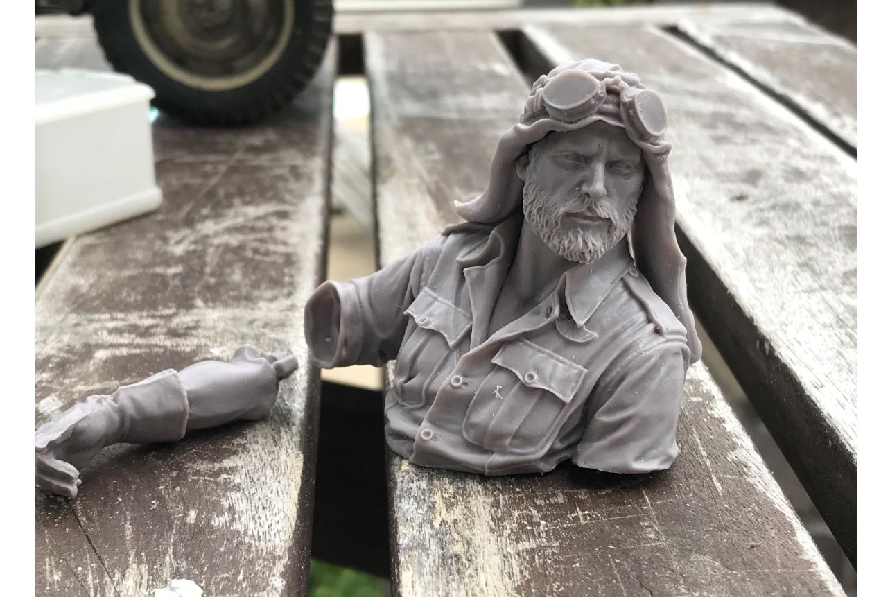 Far from being perfect, the joining of the 2 components is a best effort with what's available. I could determine that the action figure is not really 1/10, it is probably closer to 1/12, but if it was bigger, i would not be able to fit the legs in the Jeep. The resin busts are also greatly detailed, which make the joining a problem for consistency. Once they are primed, i will see what can be done to improve the details on the lower body.
