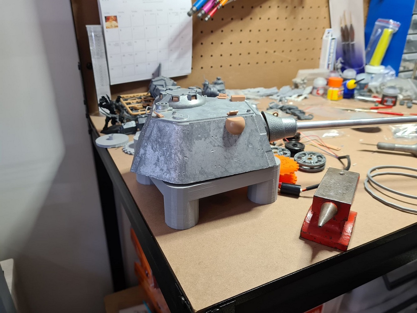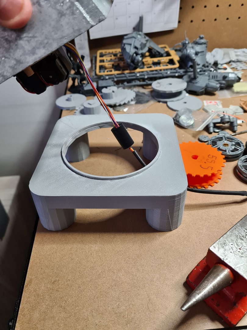 Got sick of my turrets lumpen rolling around on my work bench, so I designed a maintenance cradle for it. Now i can swivel it around when I get bored making pewpew noises. It fits all my Torro turrets pretty well, I guess anything with a 90mm dia. turret ring. Heres the link to the .STLs if you want to print your own, and if you have a more oddball turret size, I can whip up some more .STLs pretty quick if you give me the dimensions.