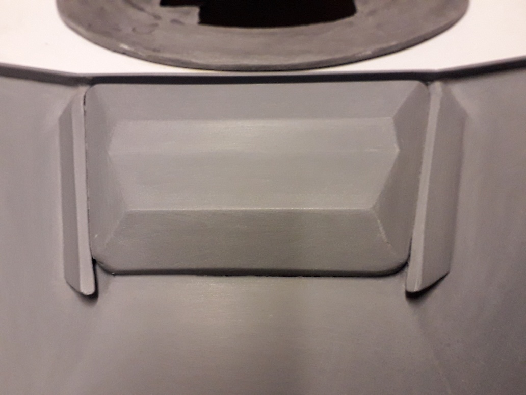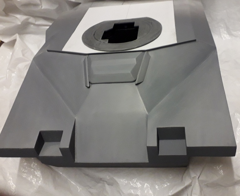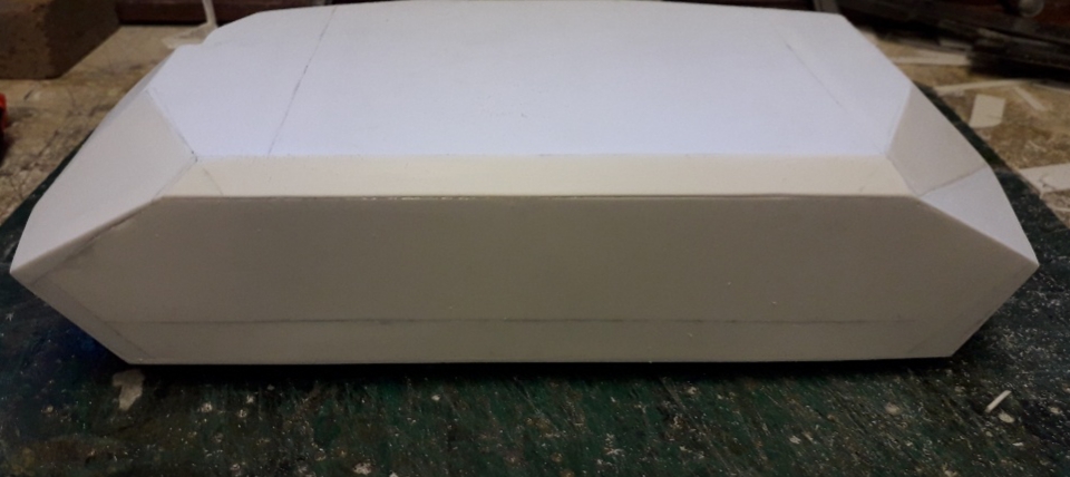 Its just the basic lower shape still in its raw state, which requires cleaning up, the odd bit of filler here and there but it shows the many angled surfaces which make up the turret shape, i still have to add the gun optics mount which will go in the cut out on the right side, the angled frontal side cover which goes over where the auto cannon side ejects the spent shell casings and all the upper turret roof, hatches etc etc.