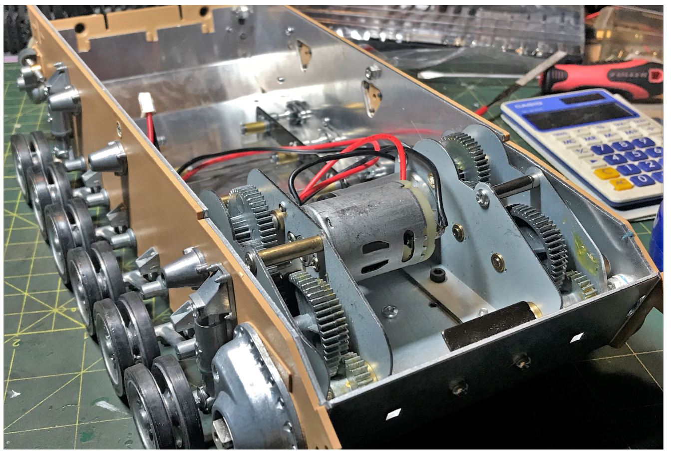 A 1.5mm plasticard plate is put on top, with limited grinding inside for the flattened screw heads to coexist. The plastic sides of the hull at too short as shown by the transmission gear housing coming flush with the tip of the vertical tow bracket at the front. These should be a couple of mm there in between.