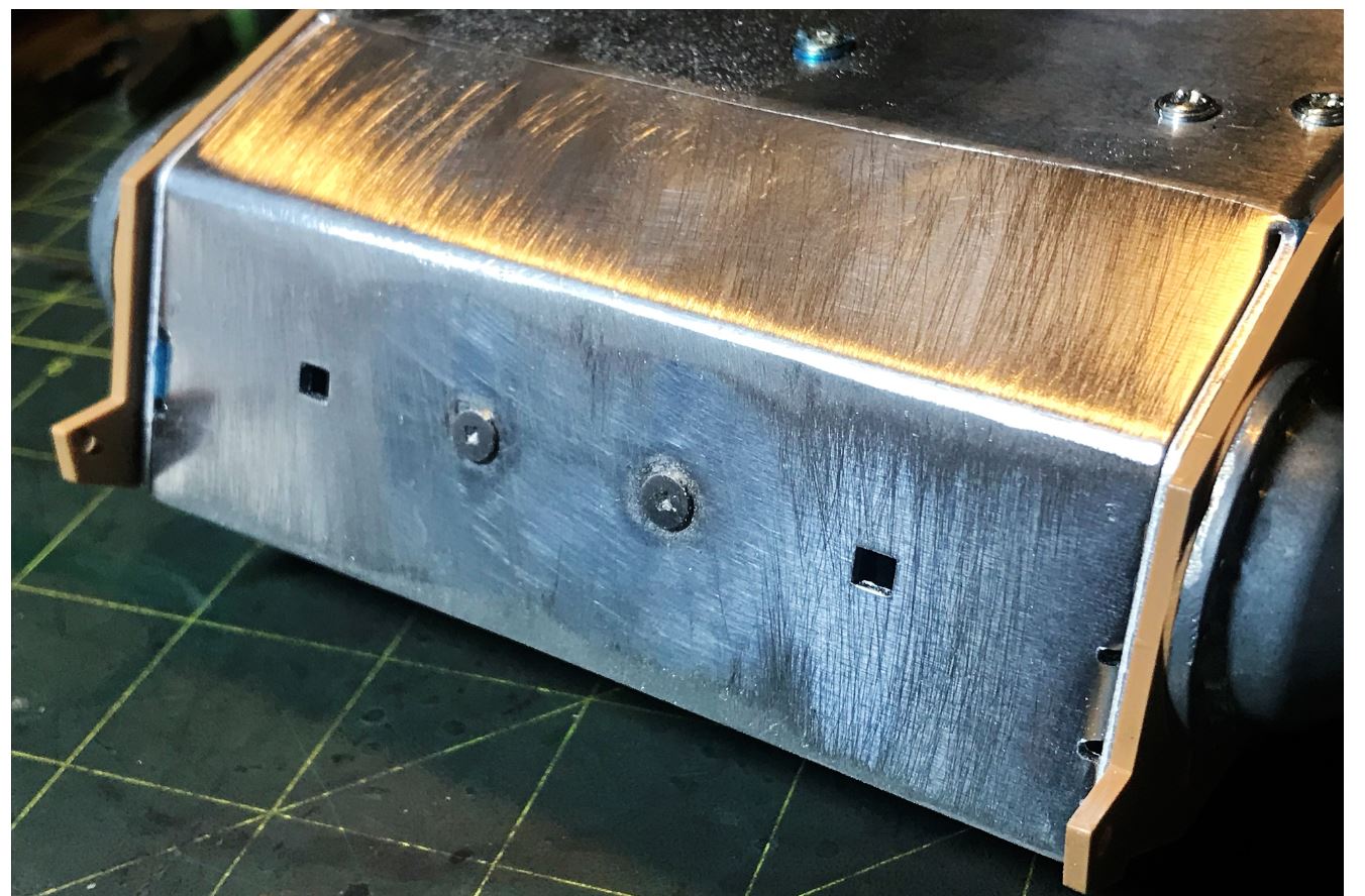 The Taigen chassis need a lot of work at the front. A plasticard overlay is required to hide all the holes and joints. First, the screw heads that holds the locking mechanism inside must either be replace with flat heads or grinded flat.