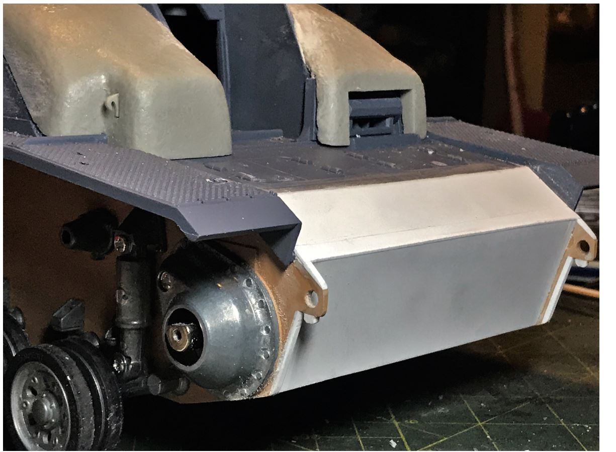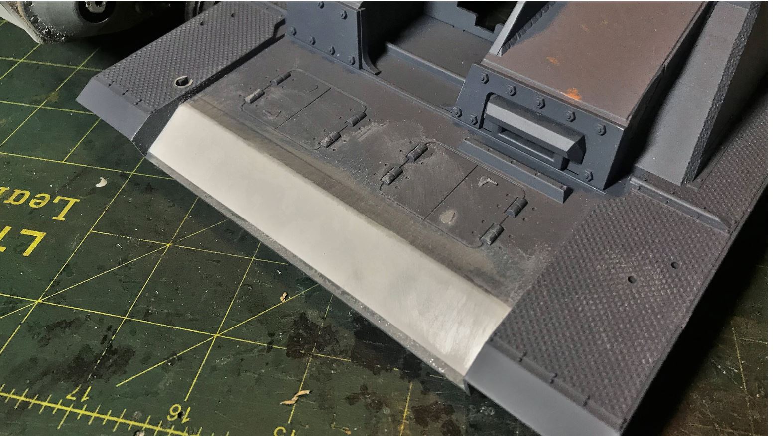 The removal of the bolted-on armor plate left holes to be plugged. A thin plasticard is used, earlier positioned and glued in place in relation to the frontal plate on the chassis.