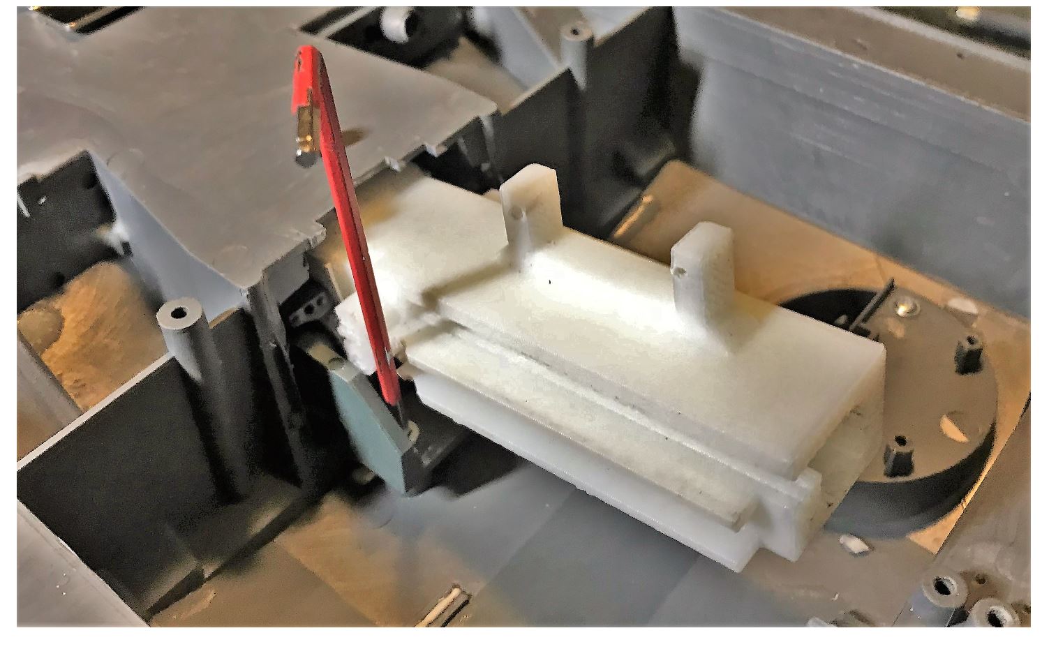 The new spare track holder is ready. The long metal rod of the butterfly nuts were kept and they go all the way into the plasticard bracket for a more solid integration.