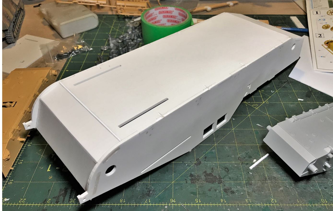 The chassis is thoroughly sanded, and dimensions are close to the extrapolated 1/35 references, with a tolerable couple of mm of differences in length compared to Tamiya. Its a bit too long.