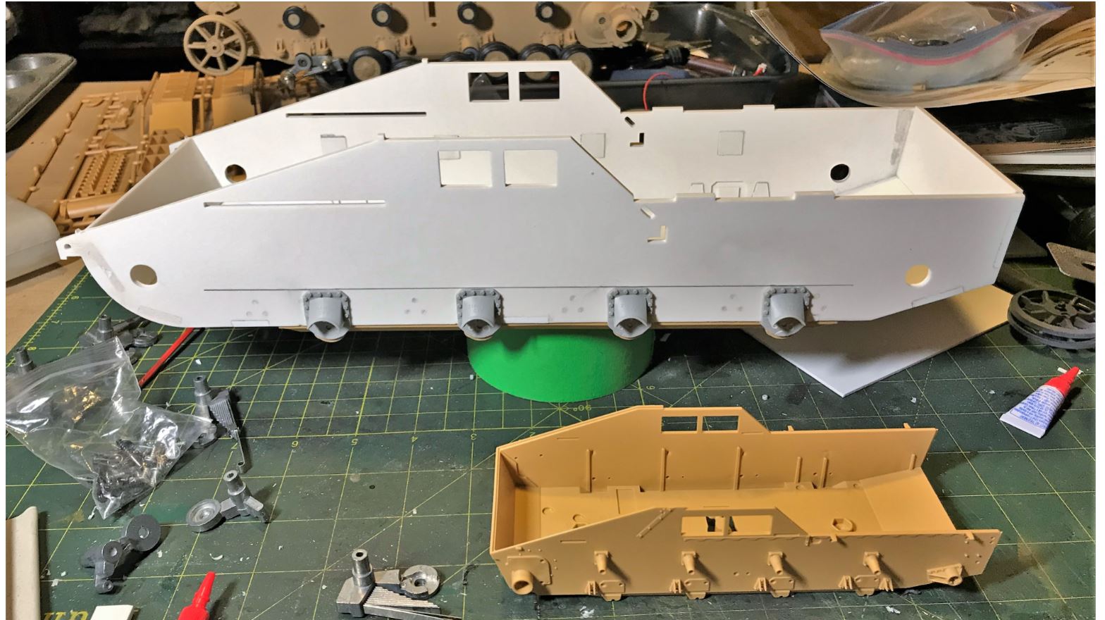 Some of the assembled parts for the build, accumulated over the years. The build will use the Ludwig Nashorn base kit in Polystyrene which is definitely not a kit for the beginners. It is just now, in the middle of a pandemic and with nothing else to do during the holidays that i summoned the courage to build it. I build the Juckengurg Nashorn a few years ago, which also offered a Hummel. Juckenburg was retaken by MK Modellbau but they never issued both. The Nashorn kit was not very good.
