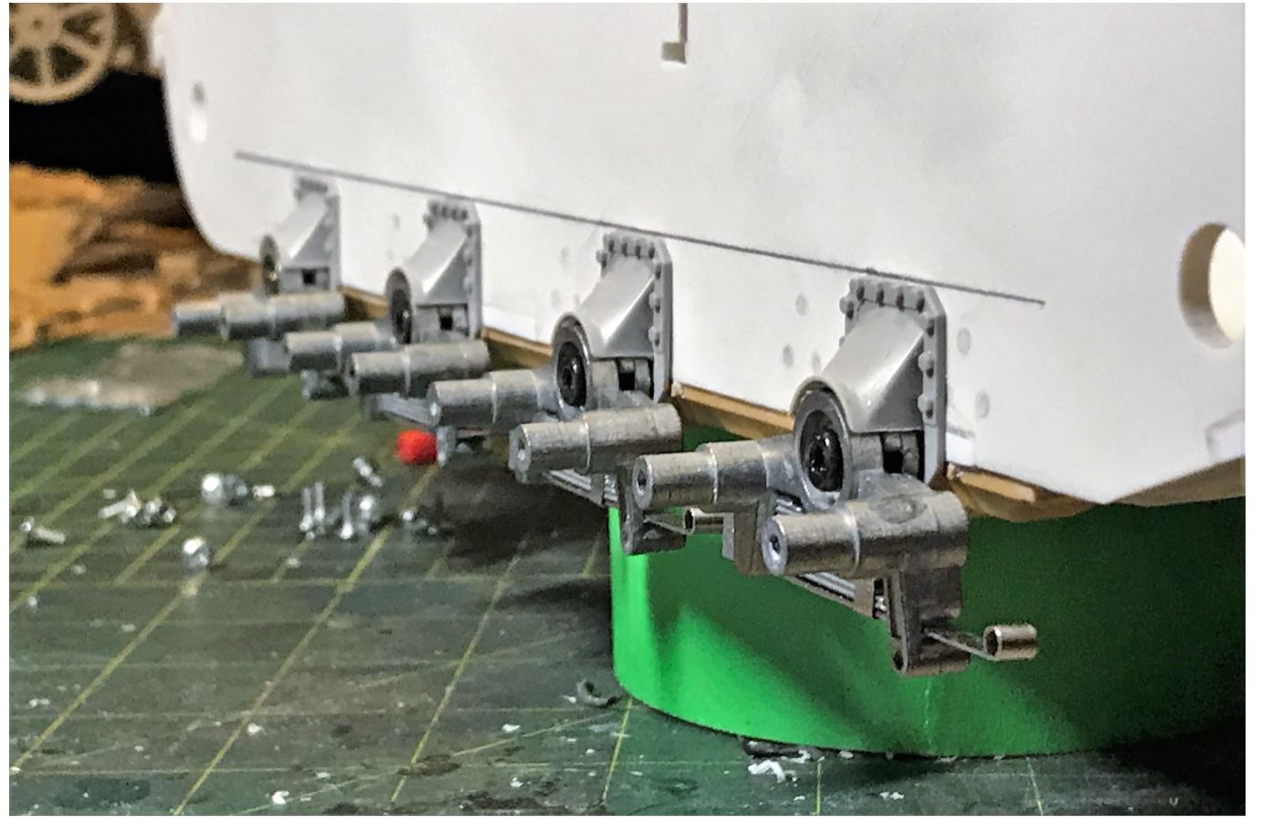 View of the gearbox installation. The Mato base plate is solidly installed on the plasticard mounting, with hex bolts going all the way through the hull bottom.