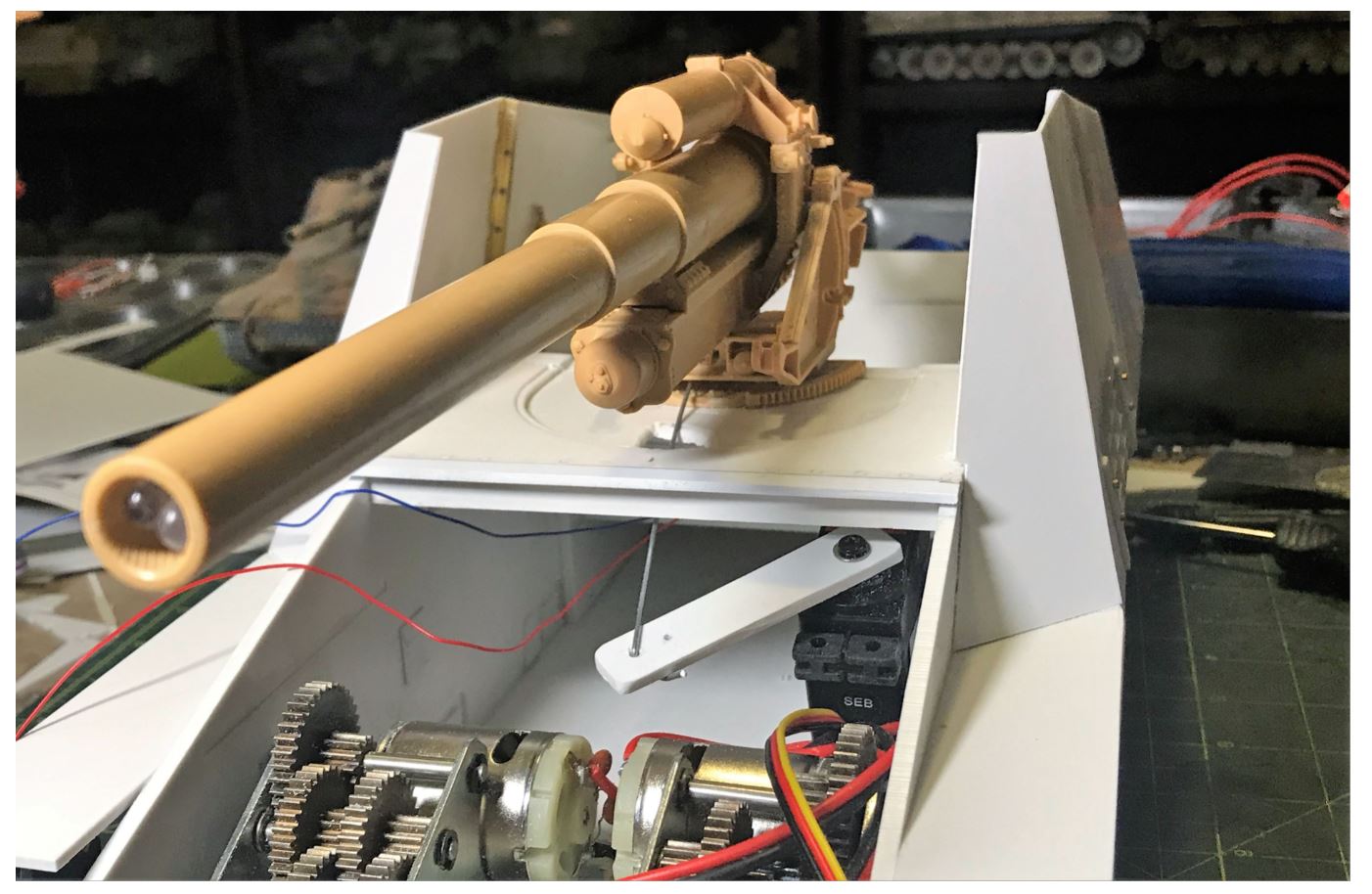 A hole was made at the front of the gun mount, providing enough room for the push rod to operate freely. All this area will be hidden behind the gun shield.