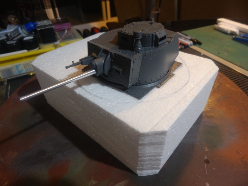 The turret and base plate received a red oxide primer, then hairspray(jeez that stuff is magnificent on the senses, smells like the Mrs getting ready for a big night out ;) ) then a can coat of TS 4 German Grey, which took on a nice hue once dry.