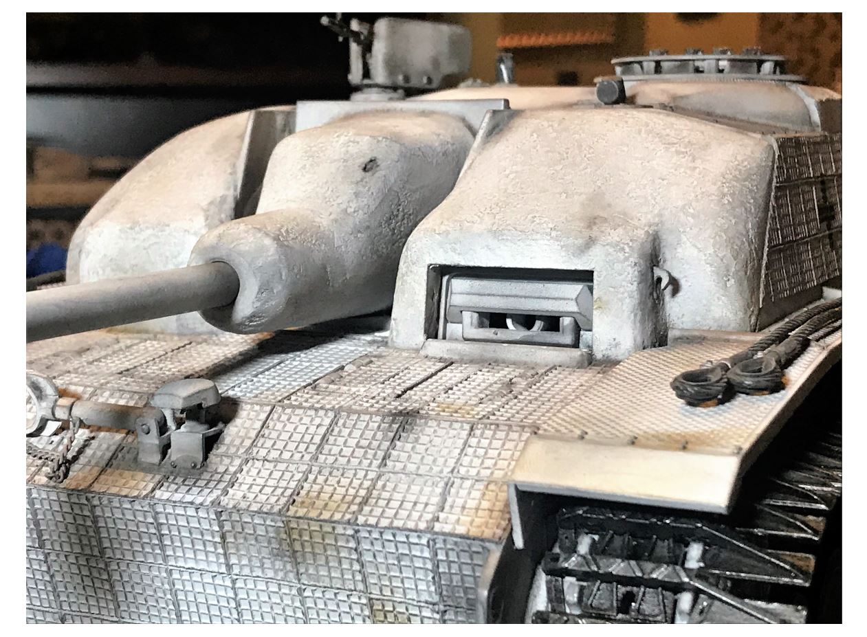 A rain tarp for the gap between the mantlet and hull is made of kitchen rubber glove material leftover from the Leopard C2 Mexas build of last summer has been used. Works perfectly.