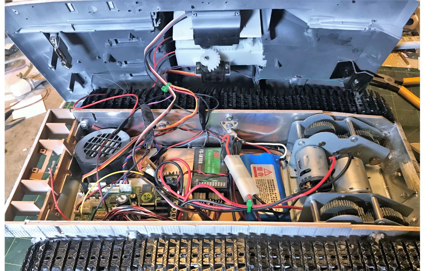 View of the electronics. Nothing special, Clark TK-60 and recoil unit. Servo elevation, Heng Long speaker and gearbox.